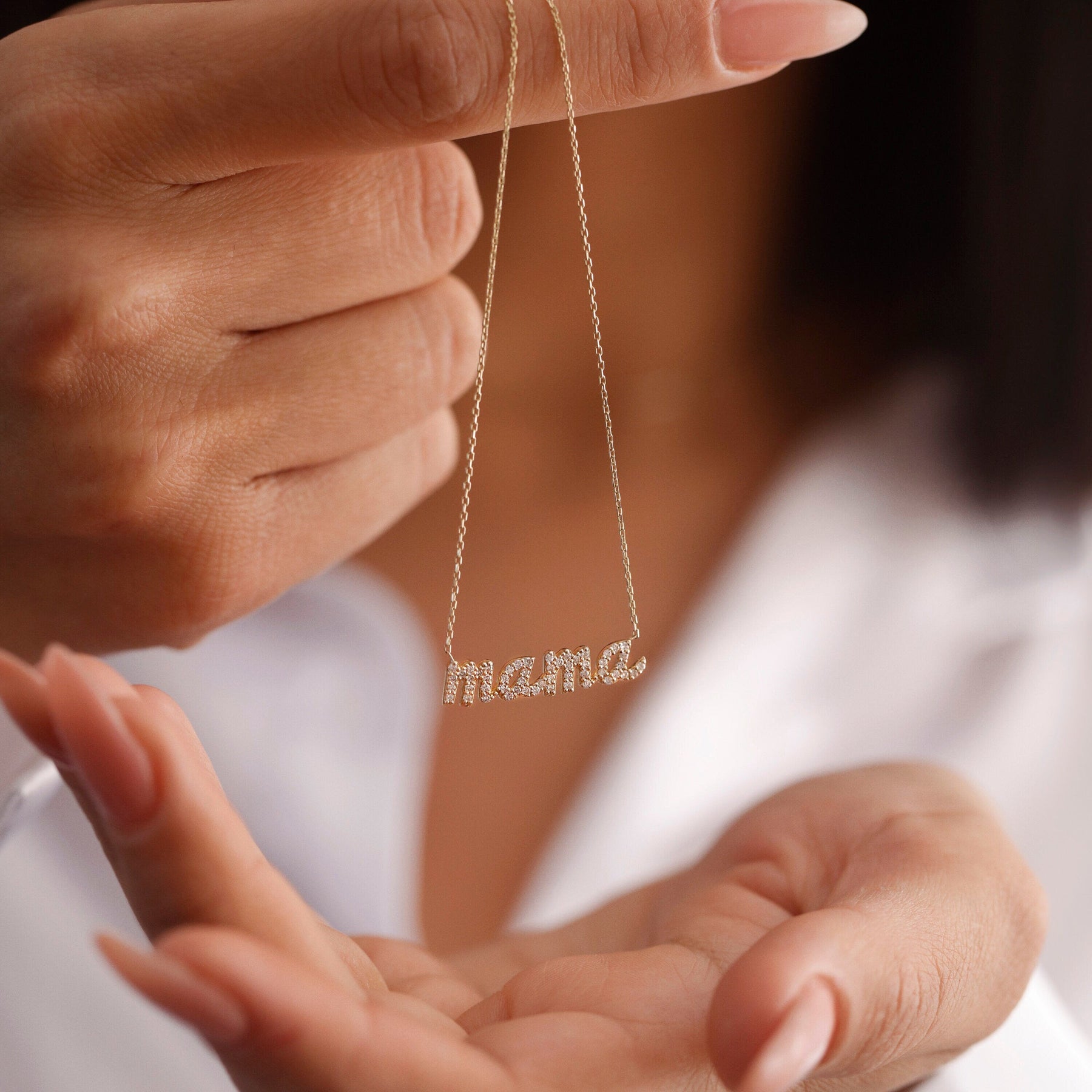 ✥ Celebrate the special bond of motherhood with our Diamond Moissanite MAMA Necklace in 14K Yellow Gold, a heartfelt and stylish accessory for moms everywhere. This charming necklace features the word "MAMA" spelled out in dazzling diamonds and moissanite stones, set in radiant 14K yellow gold. The pendant is designed to sit elegantly on the neckline, making it a perfect everyday piece to cherish the love for your children. Whether worn as a symbol of pride or given as a thoughtful gift to a mother figure, this Diamond Moissanite MAMA Necklace is sure to be a cherished keepsake for years to come.