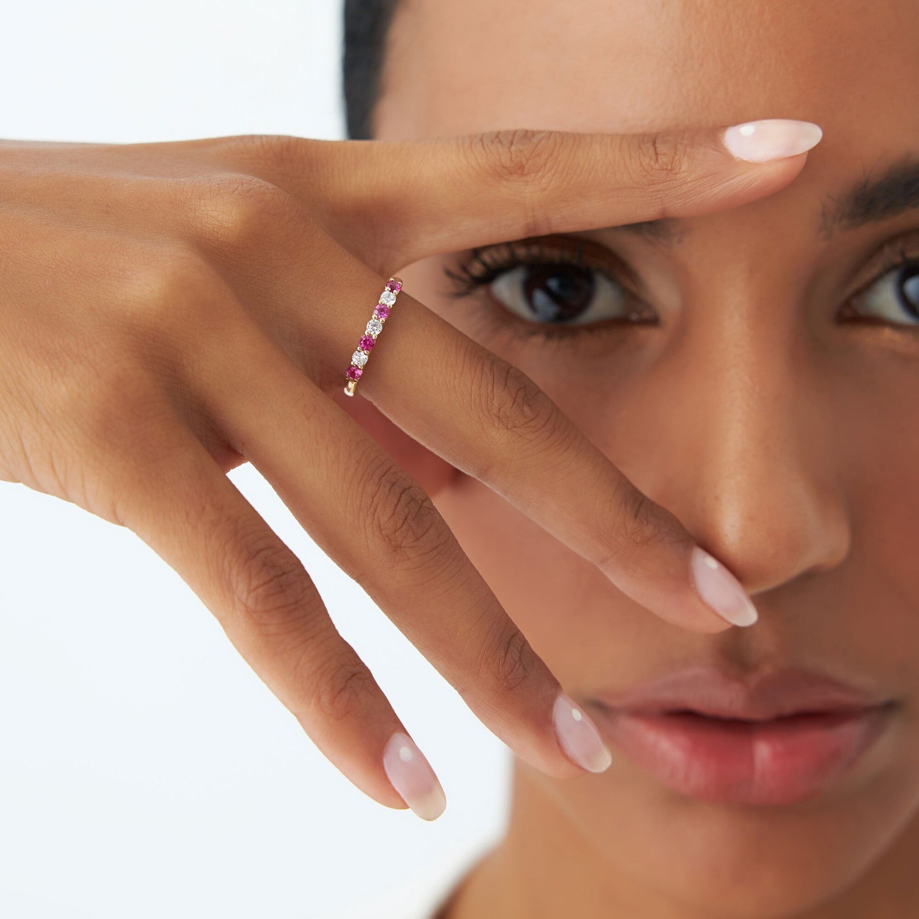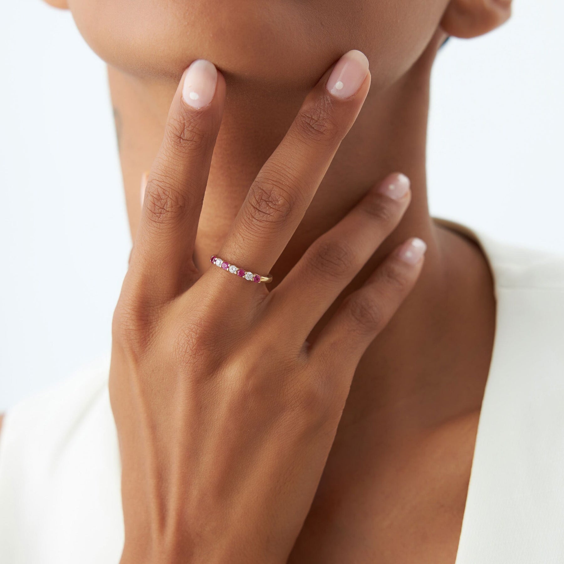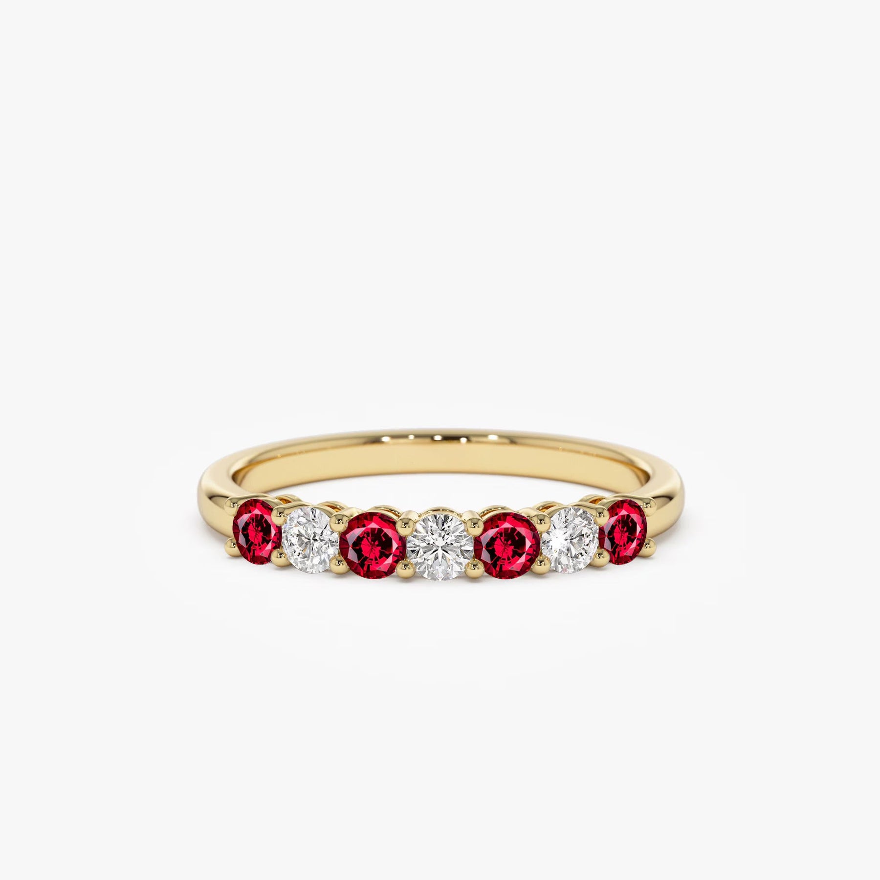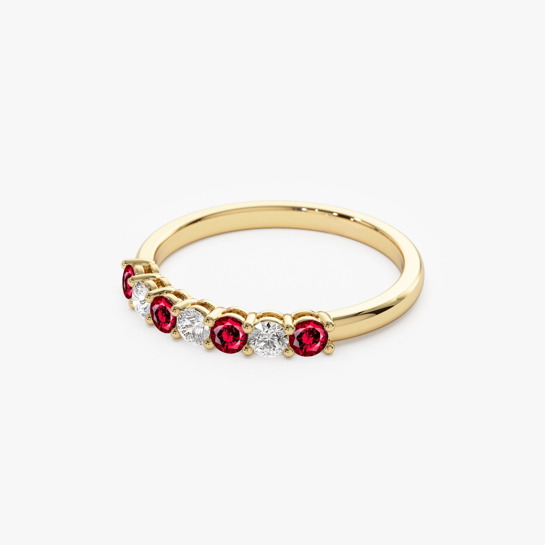 ✥ Celebrate a lifetime of love and devotion with the exquisite Round Ruby and Diamond Wedding Band for Mother. This stunning wedding band features a timeless design with alternating round rubies and shimmering diamonds, symbolizing the enduring bond of marriage. Crafted with precision and care, the ring is made from high-quality materials, ensuring lasting beauty and durability. The deep red hues of the rubies complement the brilliance of the diamonds, creating a mesmerizing contrast that catches the light with every movement. Whether worn as a wedding band or a stylish accessory, this ring is a meaningful and elegant choice for any mother. Honor her love and sacrifice with this beautiful symbol of eternal love and commitment.