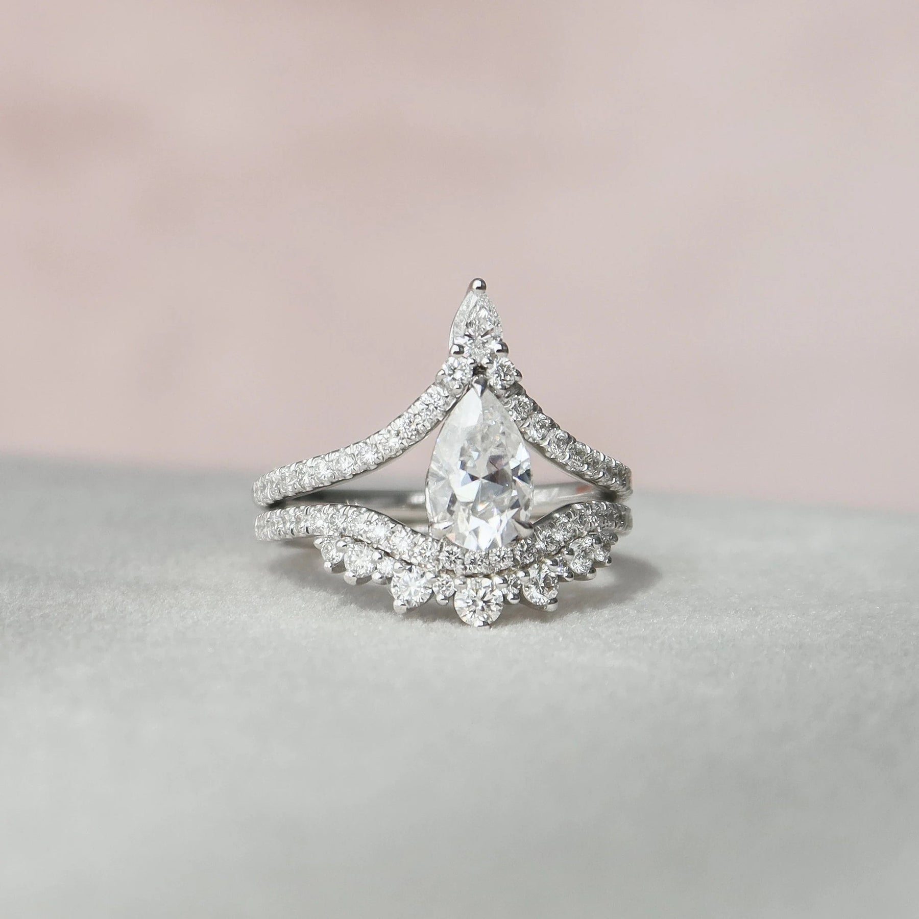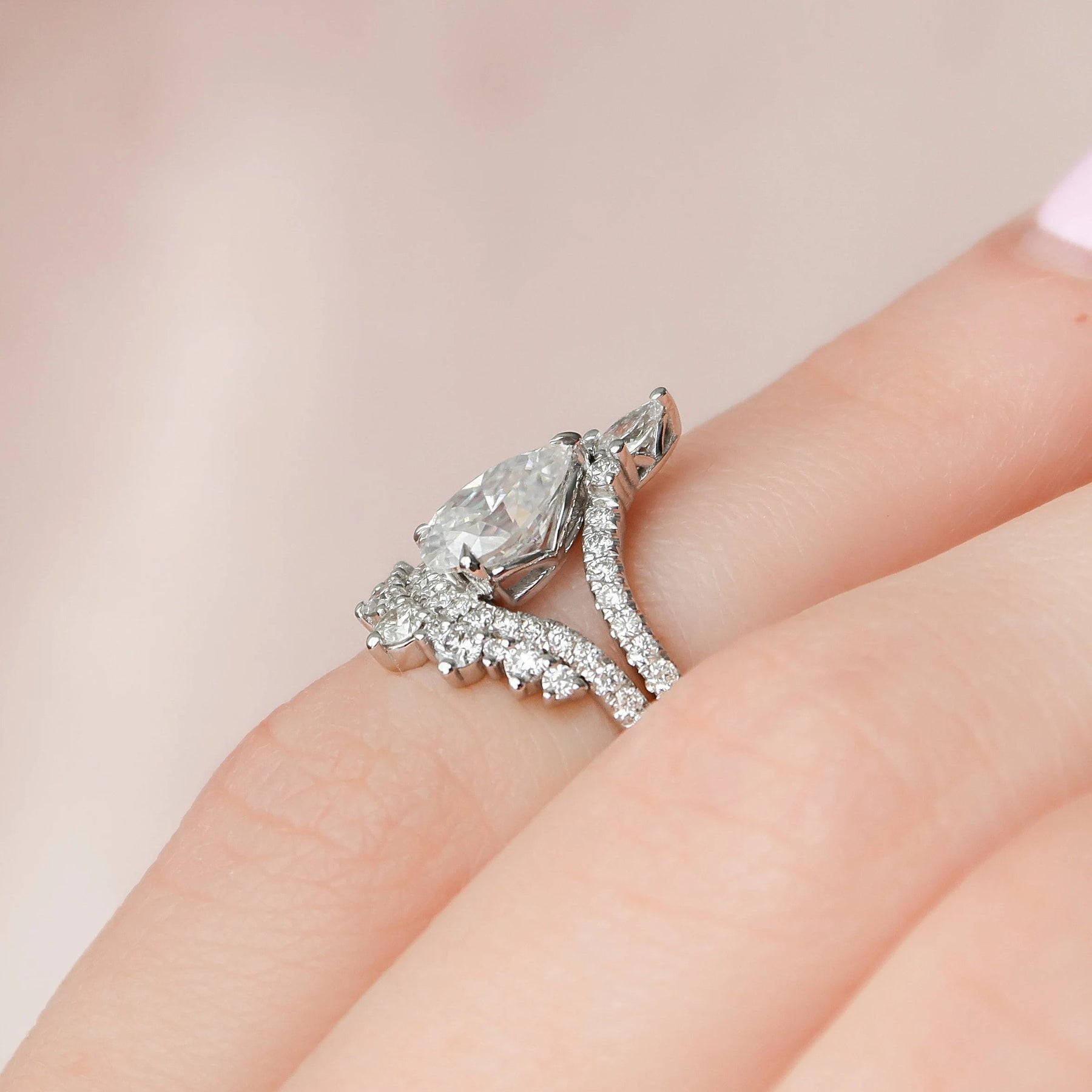 1.0CT Vintage Pear Cut Moissanite Halo Bridal Engagement Ring Set