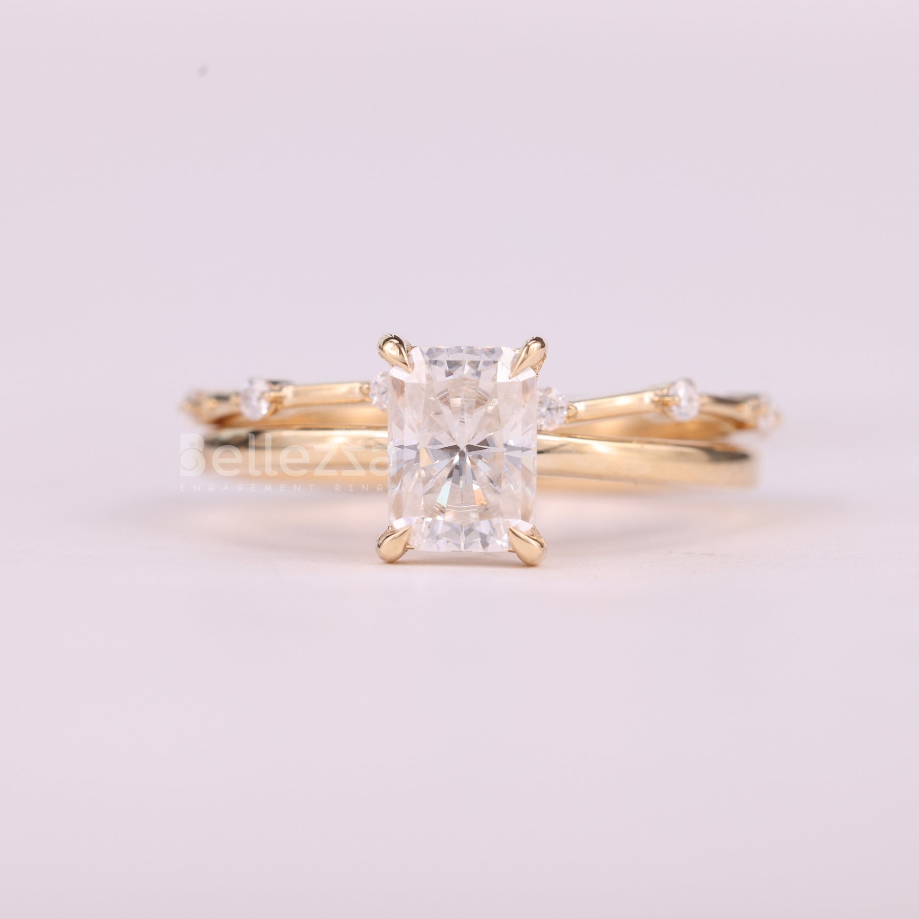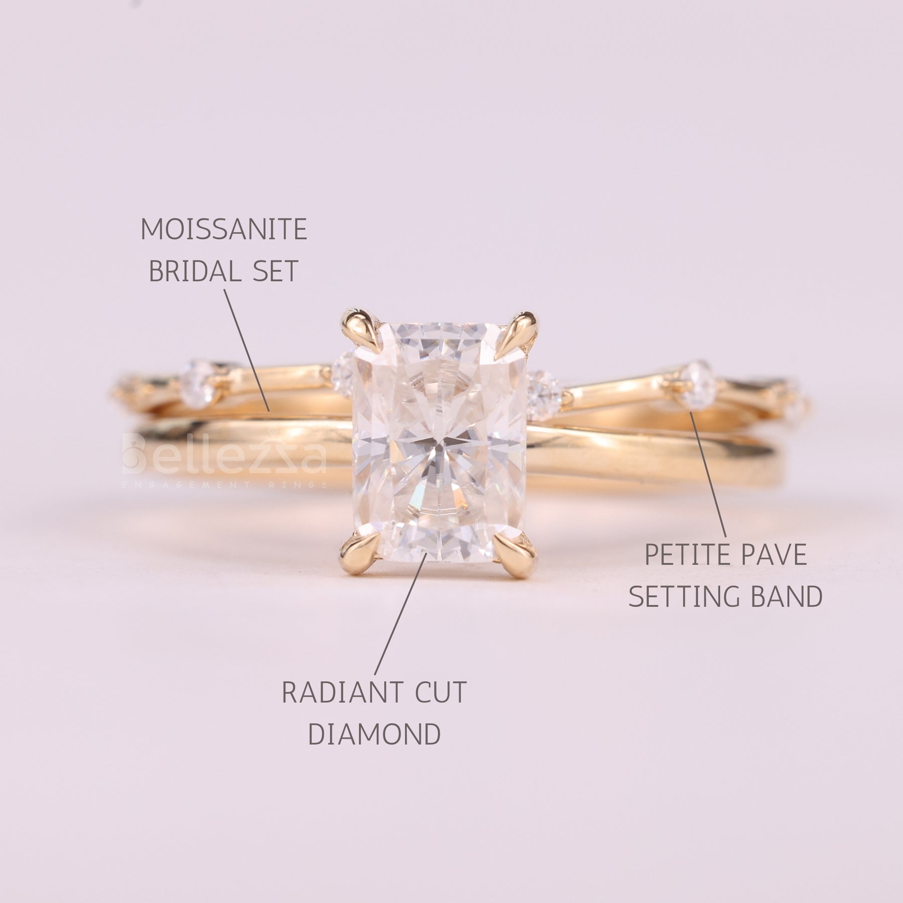 ✥The image showcases our elegant 1.0CT Radiant Cut Hidden Halo Moissanite Bridal Ring Set, designed to combine timeless sparkle with modern sophistication. Featuring a brilliant radiant cut moissanite center stone, this hidden halo engagement ring is paired with a matching band for a complete bridal ring set that exudes luxury. Expertly crafted, this moissanite engagement ring delivers lasting brilliance and refined elegance. Perfect for brides seeking a distinctive and glamorous style, this radiant cut bridal ring set makes every moment unforgettable. Celebrate love with this exquisite hidden halo moissanite ring, a true symbol of commitment.