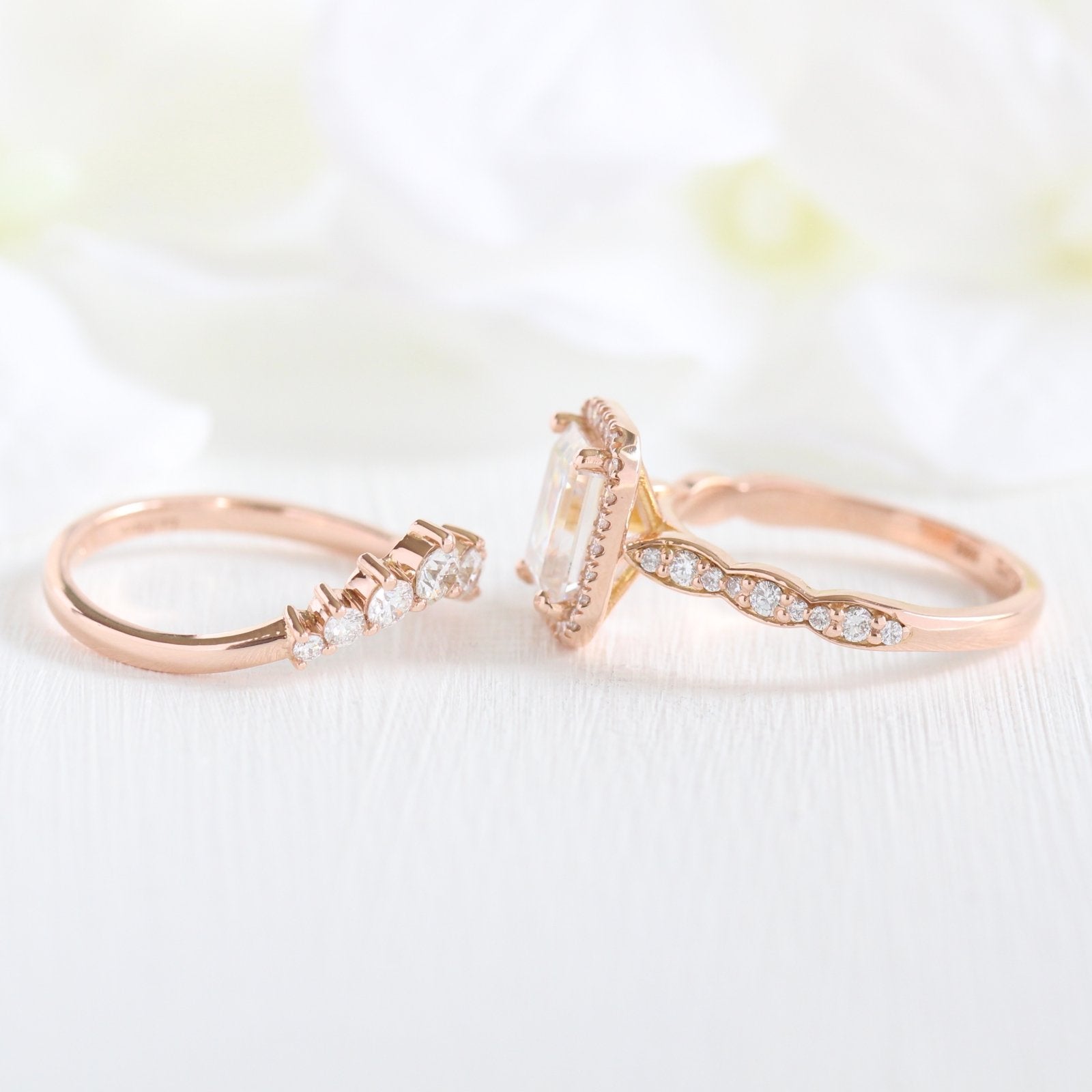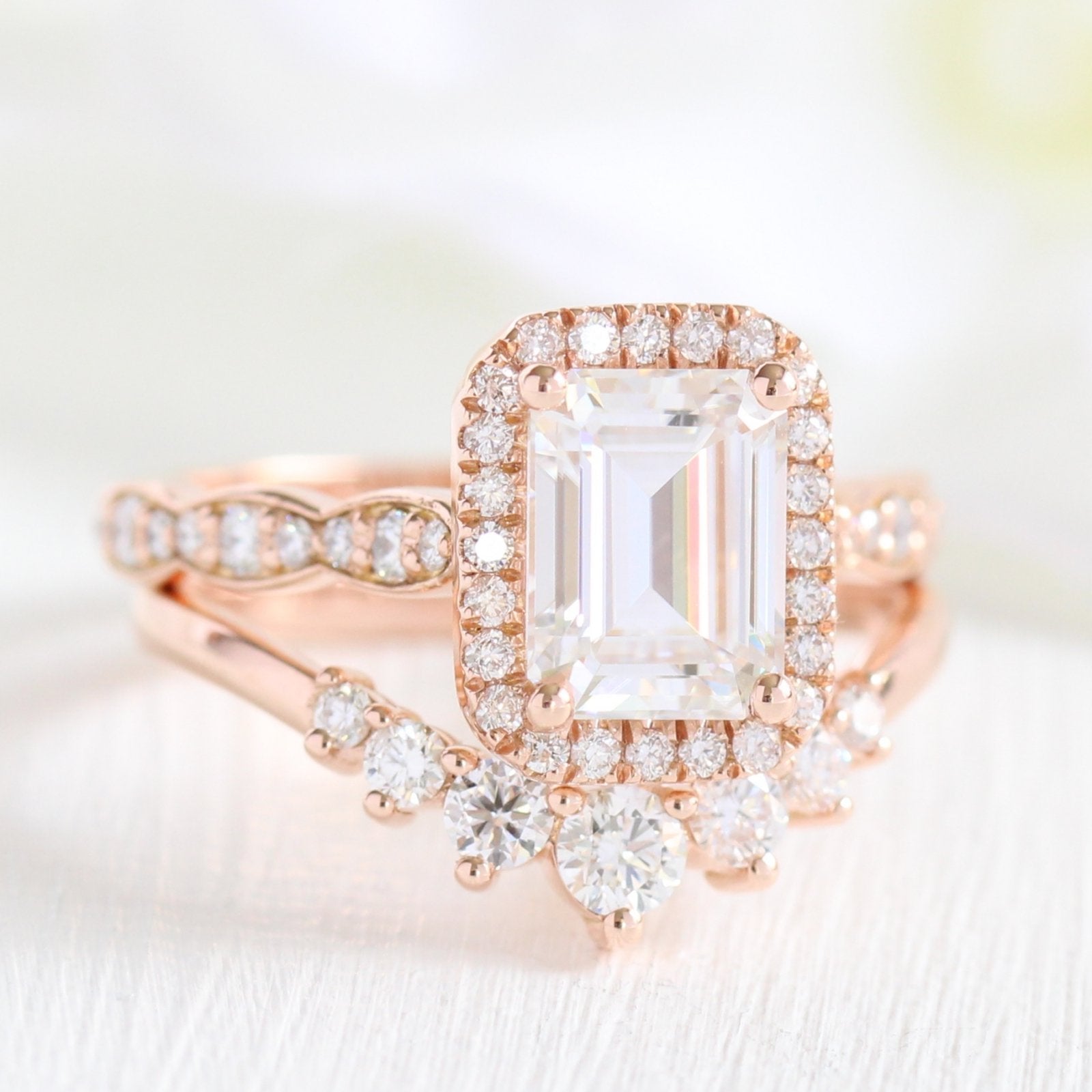 1.60ct Emerald Cut Moissanite Halo Ring With Curved Matching Band