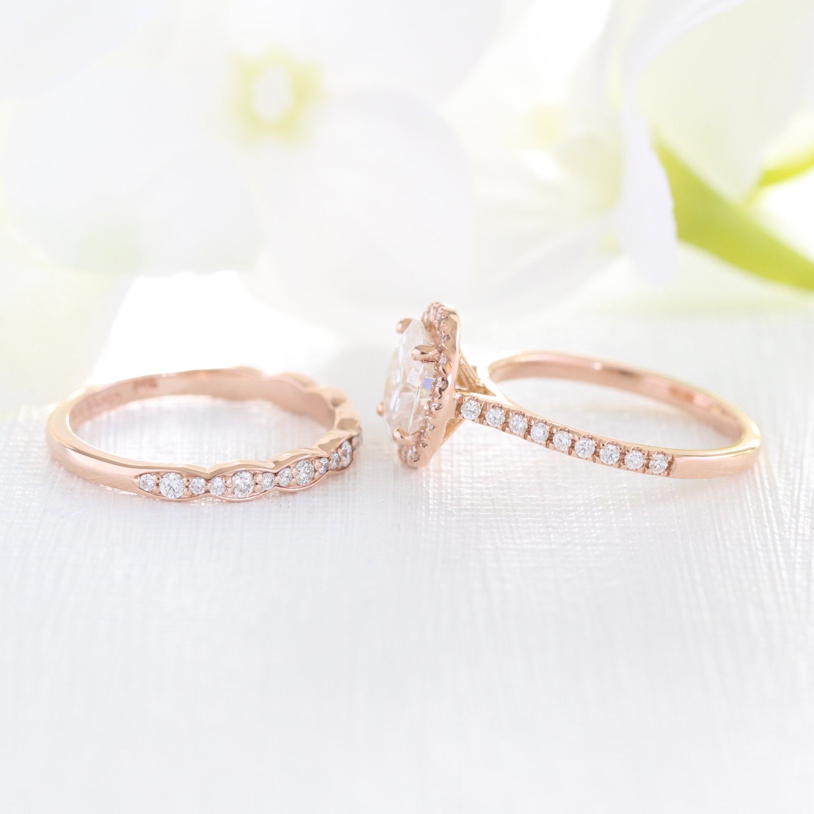 Oval Halo Pave Moissanite Ring With Scalloped Diamond Band