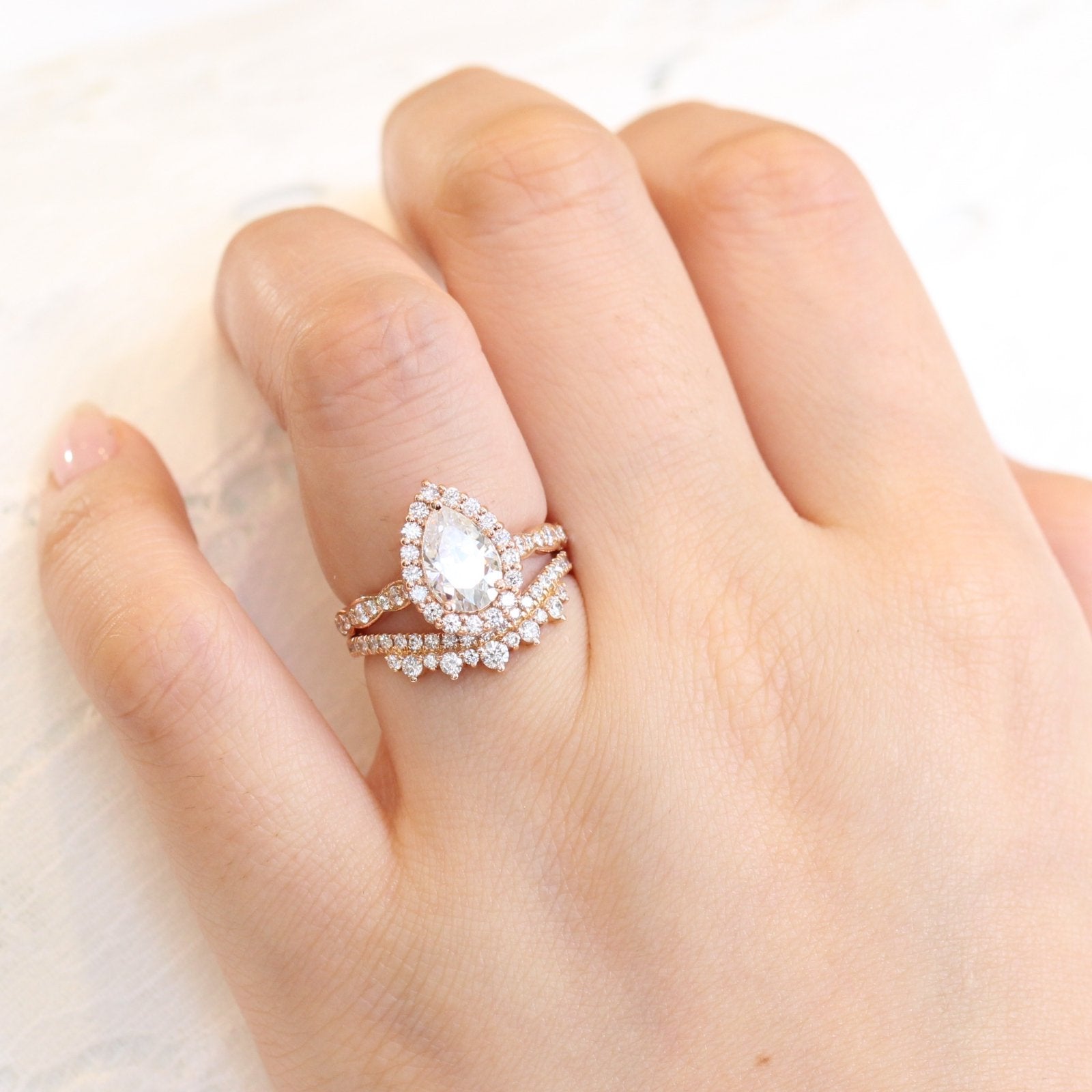 1.50ct Pear Cut Moissanite Halo Ring With Crown Diamond Band