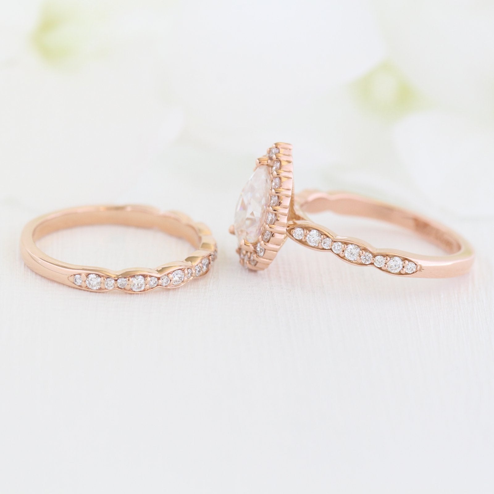 Pear cut moissanite with halo bridal band set 14k in rose gold