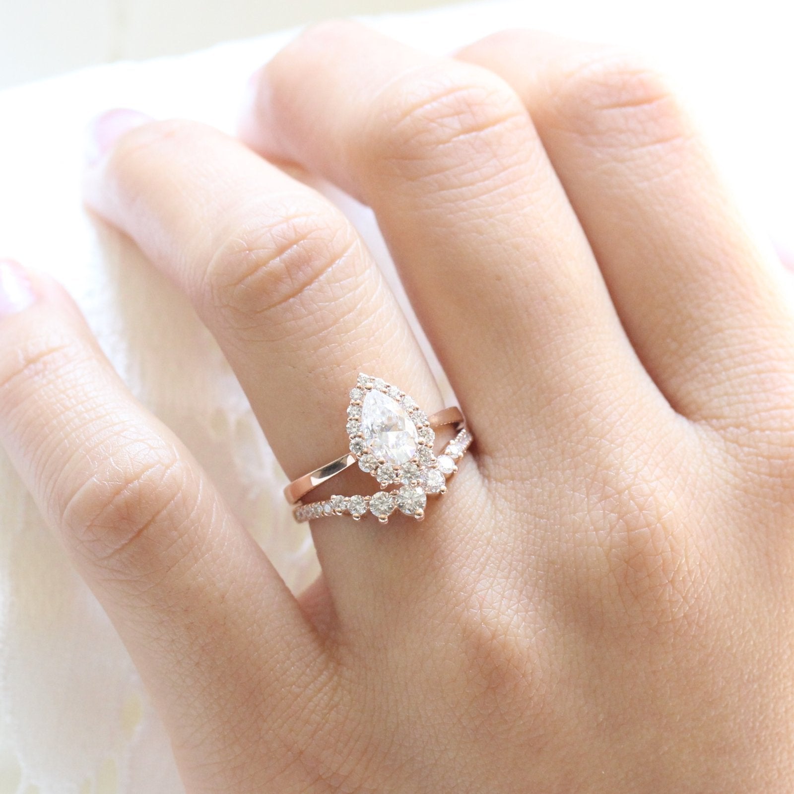 Pear cut moissanite with pave bridal band set 14k in rose gold