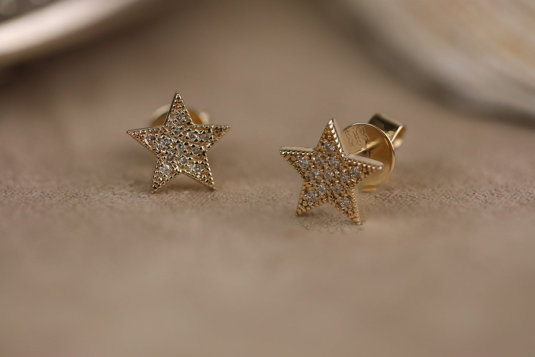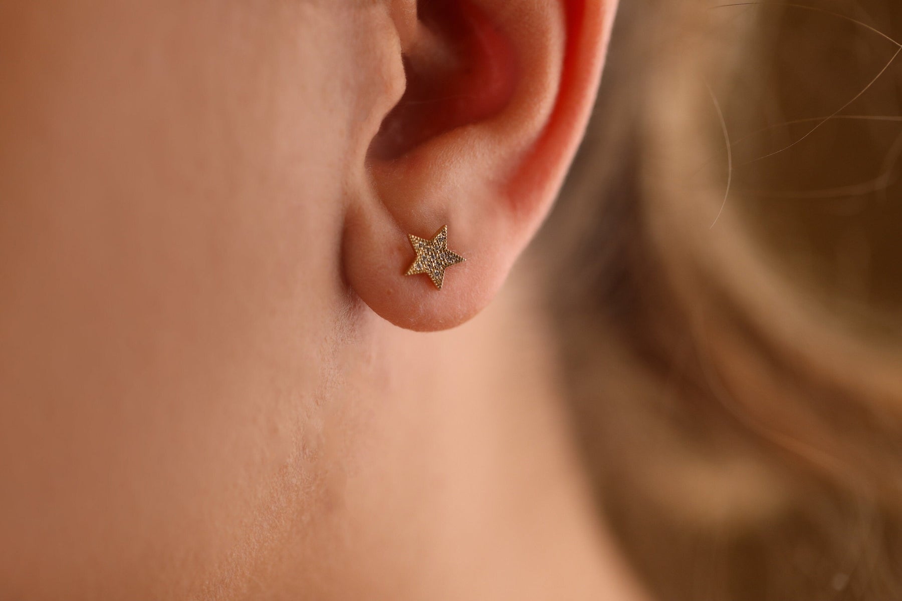 ✥ Introducing our captivating 0.2CT Round Star Shaped Moissanite Diamond Stud Earrings, meticulously crafted in luxurious solid gold. These earrings feature a stunning star-shaped design adorned with round moissanite diamonds, each meticulously set to radiate celestial brilliance. Ideal for adding a touch of celestial charm to your ensemble, these studs are perfect for everyday wear or special occasions, reflecting your unique sense of style and love for celestial beauty. Embrace the allure of the stars with these exquisite earrings, designed to shimmer and sparkle with every movement, enhancing your look with their timeless elegance and sophisticated craftsmanship. Treat yourself or someone special to these celestial-inspired earrings, a symbol of beauty, grace, and celestial wonder.