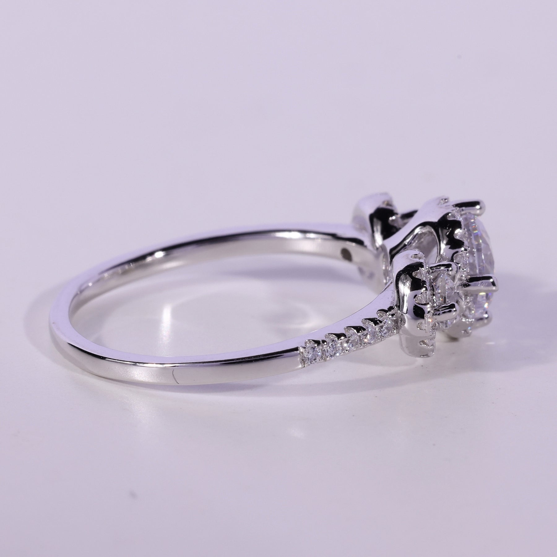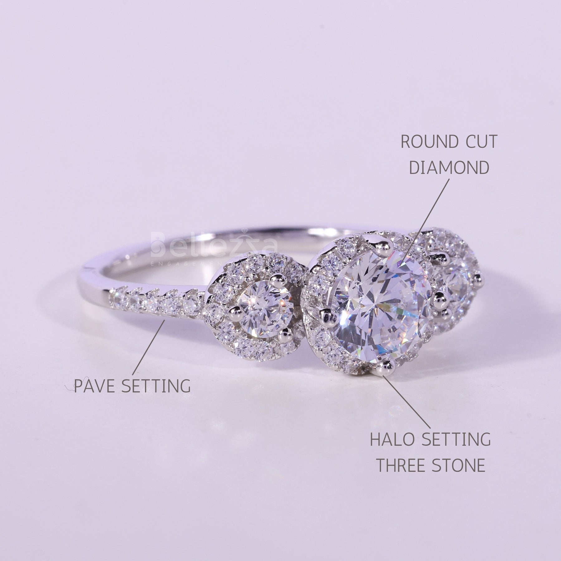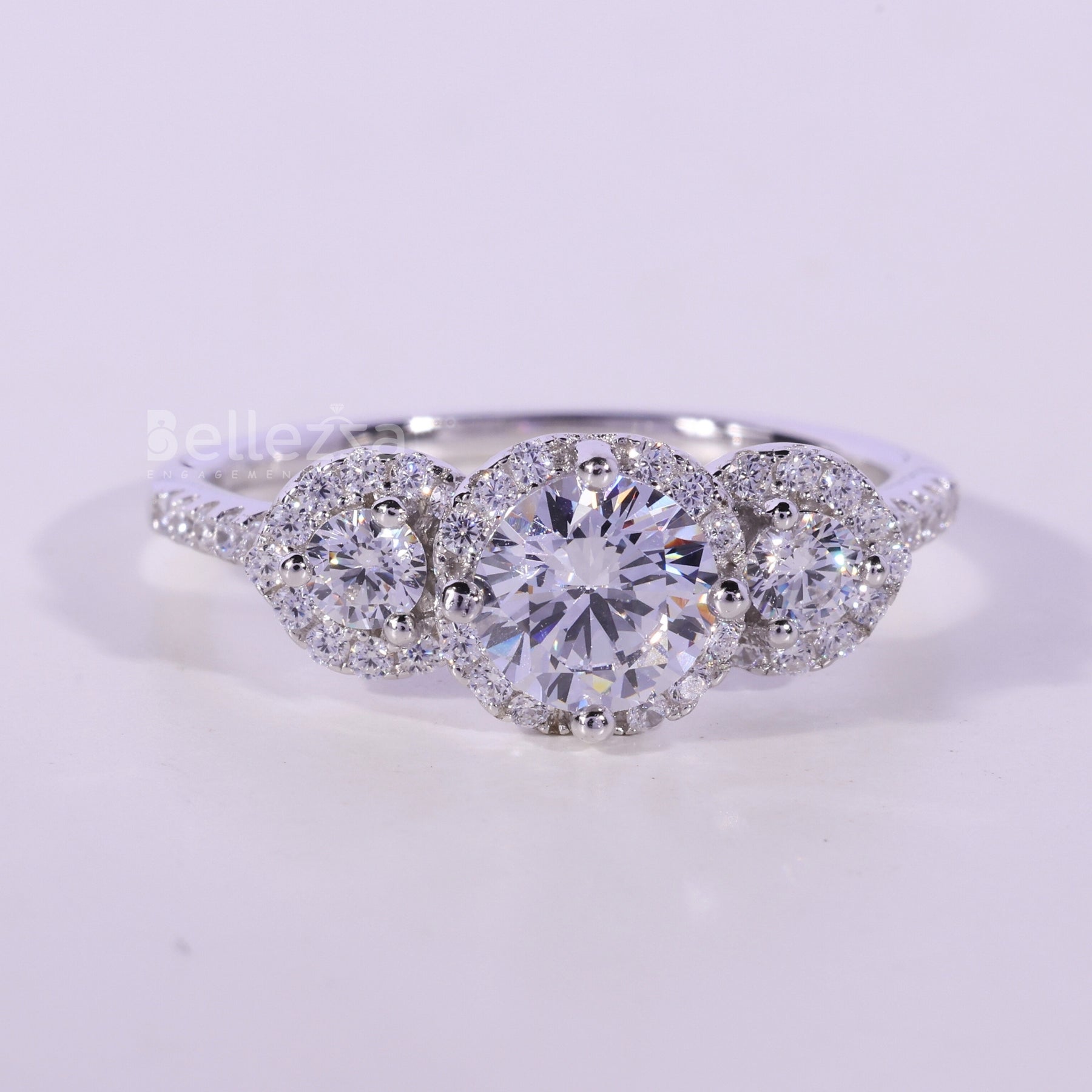 0.50CT Round Cut Three Stone Halo Setting Moissanite Engagement Ring