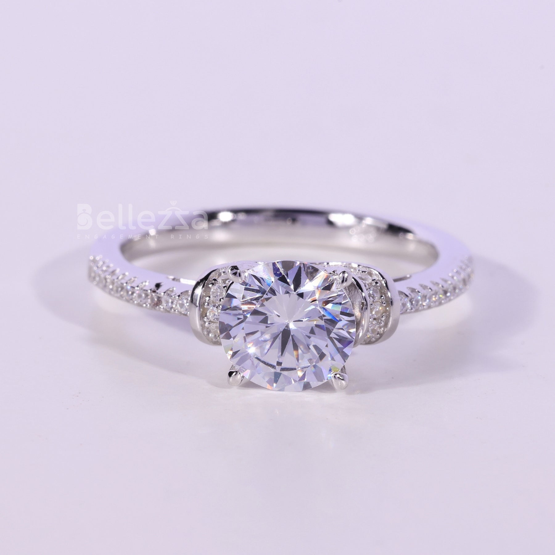 ✥The image features our elegant 0.75CT Round Cut Diamond Pave Setting Moissanite Engagement Ring, crafted to radiate timeless charm. This exquisite ring showcases a brilliant round cut moissanite center stone accented by sparkling diamond-like facets for a luxurious appeal. Its delicate pave setting engagement ring design enhances the brilliance, making it a standout piece for any occasion. Perfect as an engagement ring for her, it blends classic style with modern sustainability. This ethically crafted moissanite engagement ring delivers exceptional sparkle, beauty, and value for a lifetime of love.