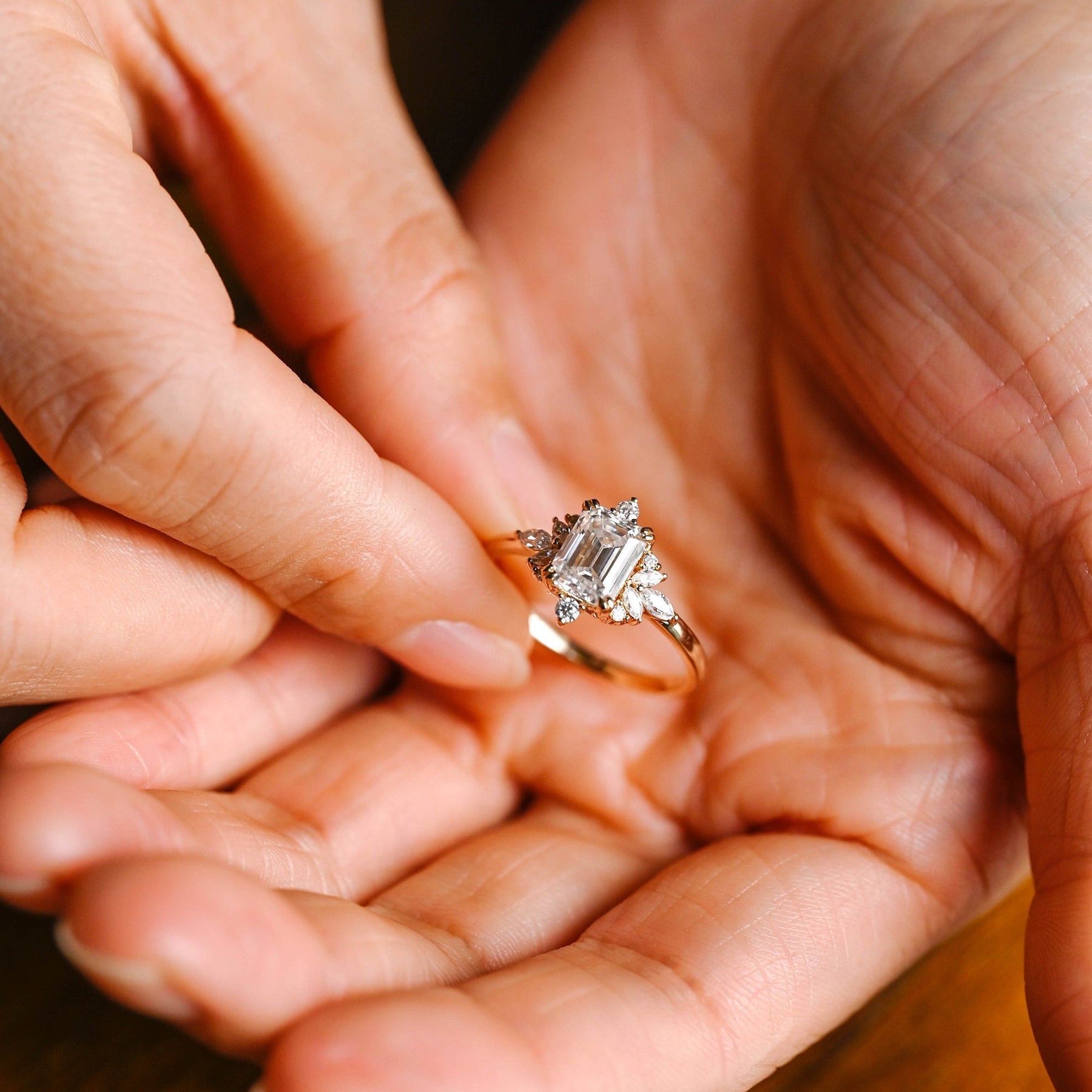1.0 CT Emerald Cut Cluster Diamond Moissanite Engagement Ring