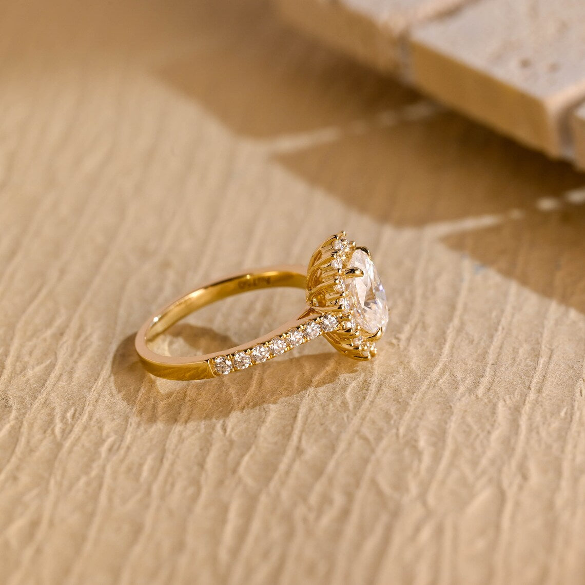 ✥This 1.50CT oval cut halo pave setting moissanite engagement ring is a stunning symbol of love and elegance. The oval engagement ring design features a brilliantly faceted moissanite center stone, radiating exceptional fire and brilliance. A sparkling halo of accent stones enhances its beauty, while the pave setting along the band adds extra shimmer and sophistication. As an oval diamond ring, its elongated shape creates a flattering and timeless appeal. Perfect for those who appreciate classic charm with modern refinement, this exquisite ring is an ideal choice for proposals, symbolizing everlasting love and commitment.