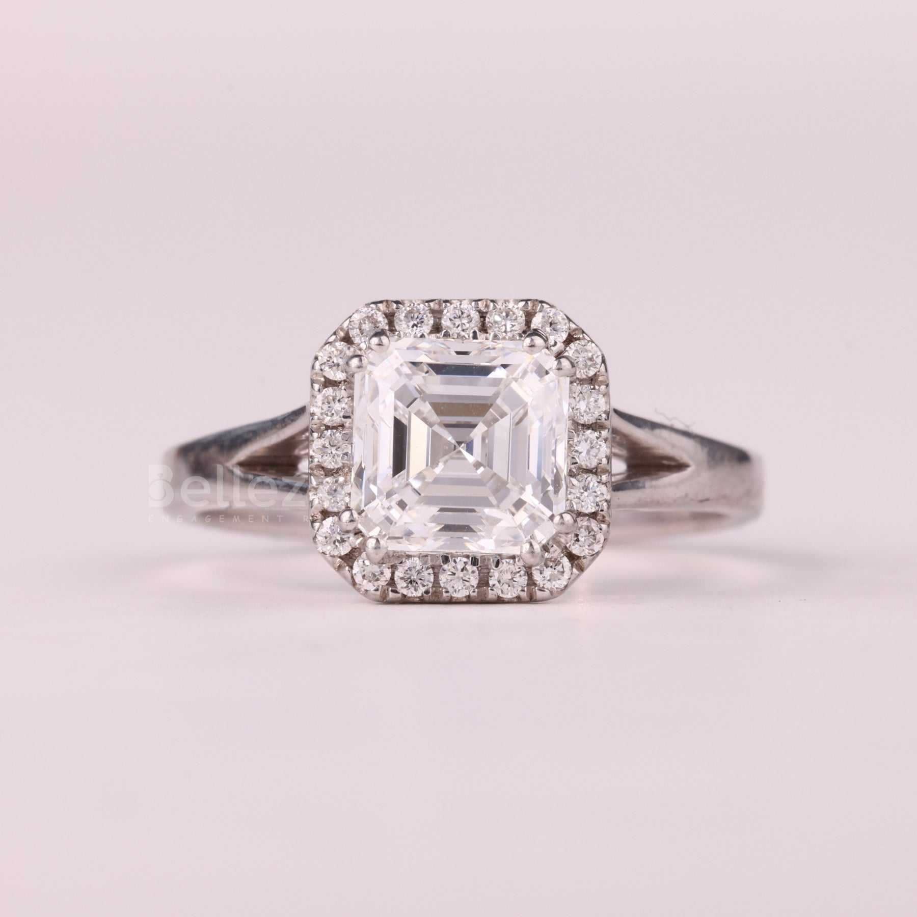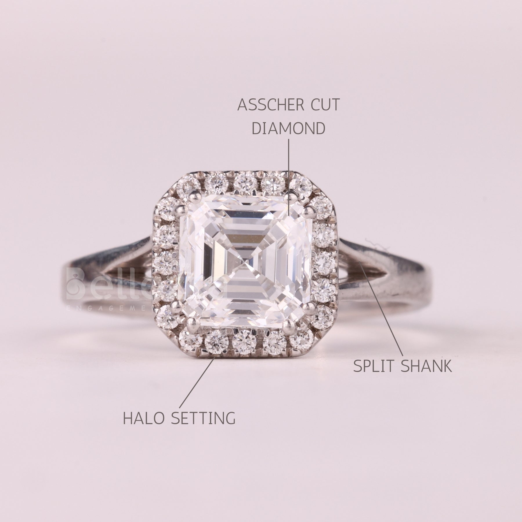 1.0CT Asscher Cut Halo Setting Split Shank Moissanite Engagement Ring