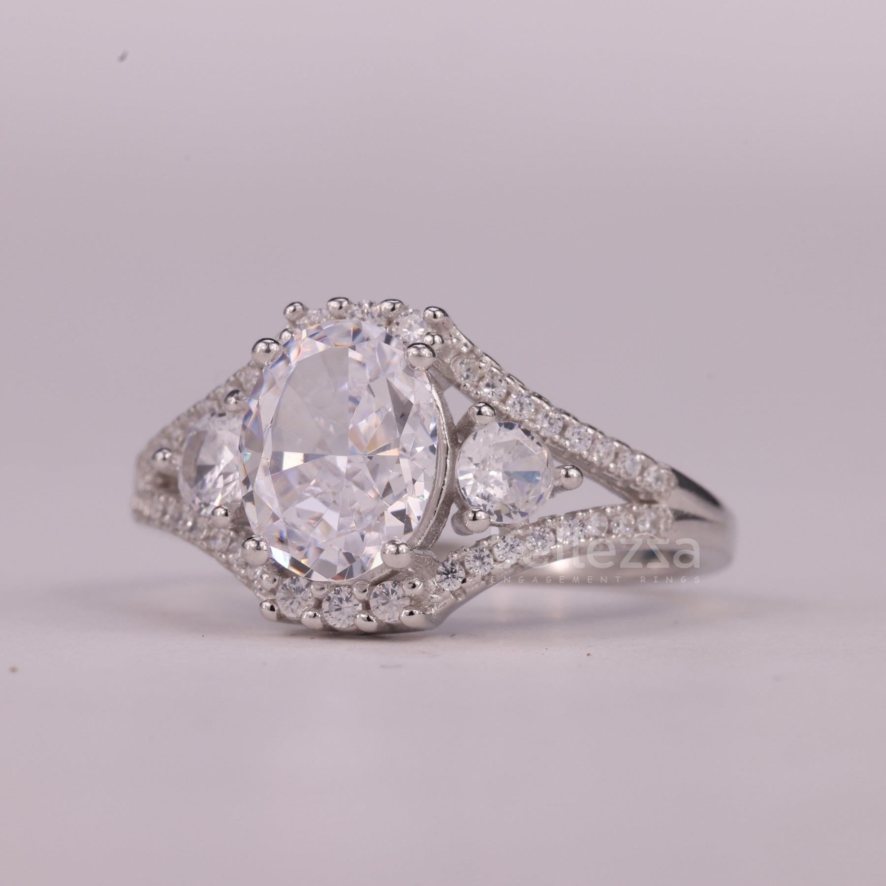 1.0CT Oval Cut Three Stone Split Shank Pave Set Engagement Ring