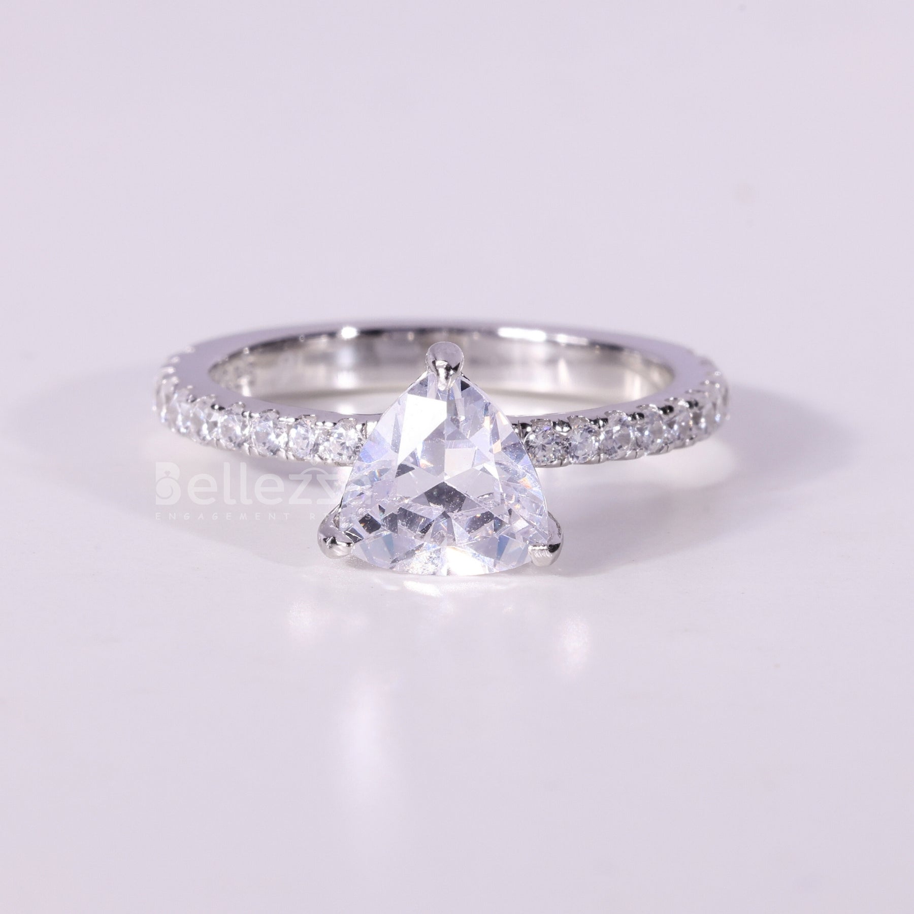 ✥This image showcases the breathtaking 1.0CT Trillion Cut Diamond Hidden Halo Pave Setting Moissanite Engagement Ring, crafted for those who adore unique brilliance. Featuring a striking trillion cut diamond-shaped moissanite center stone, it captures light from every angle for extraordinary sparkle. The elegant hidden halo detail adds a subtle touch of radiance, enhancing the center stone’s fire. Its refined pave setting offers timeless sophistication and a secure fit. Perfect for modern brides, this moissanite engagement ring delivers sustainable luxury with a bold, contemporary style. A stunning choice for anyone seeking a distinctive engagement ring to symbolize everlasting love.
