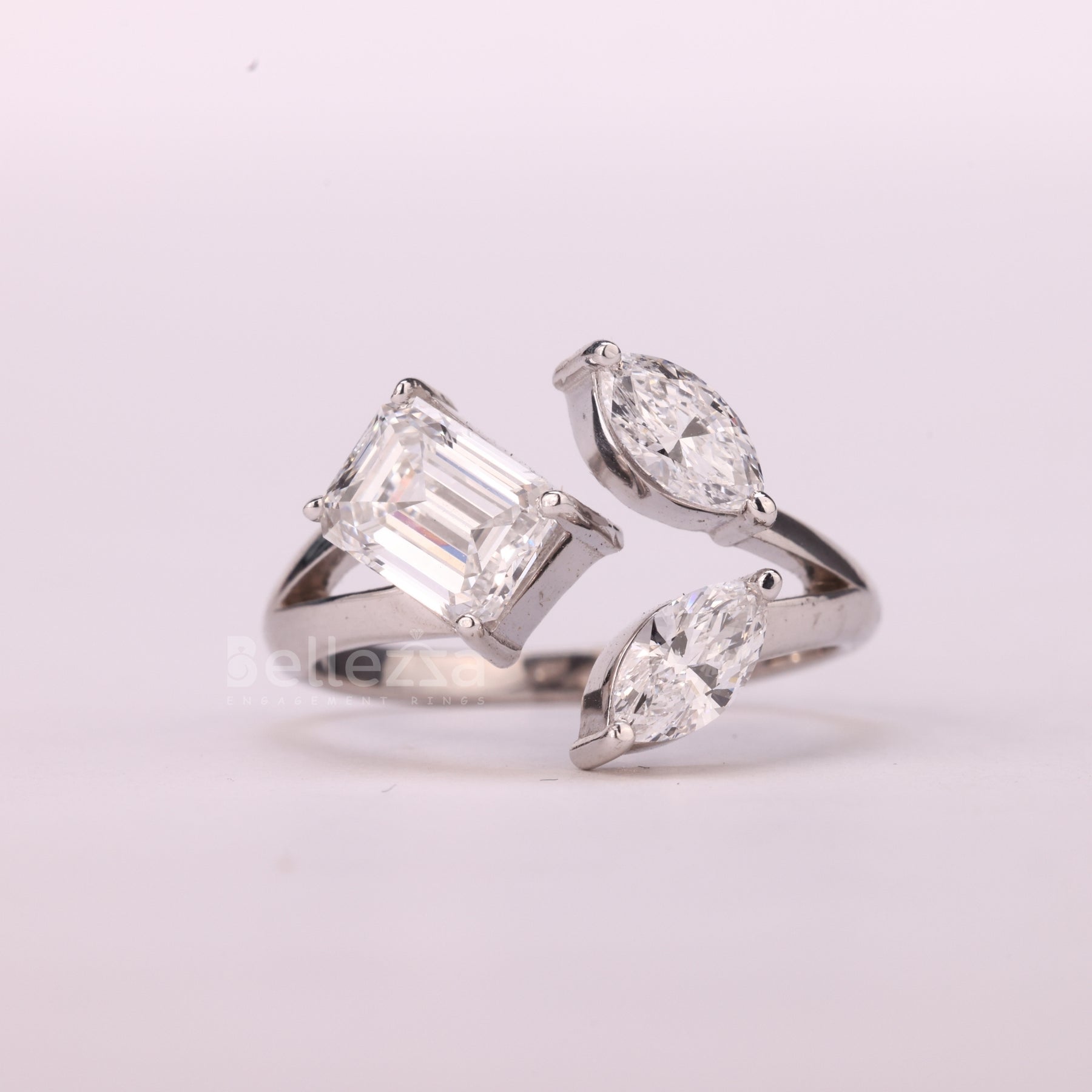 ✥Presenting the 1.50TCW Emerald & Marquise Unique Open Three Stone Engagement Ring, a modern twist on timeless elegance. Featuring a bold emerald cut center paired with two marquise cut stones in an open-style design, this ring captures sophistication with a contemporary edge. Its three-stone symbolism represents past, present, and future love, making it a meaningful and radiant choice. Crafted with brilliance and precision, this engagement ring is perfect for those seeking a unique yet classic statement of everlasting commitment.