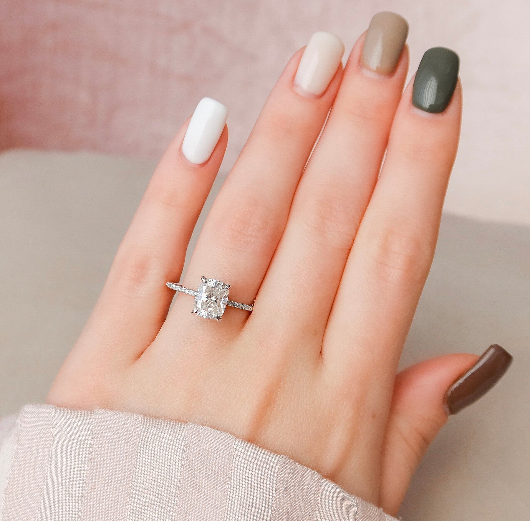 ✥ Elevate your love story with the mesmerizing beauty of our 2.5 CT Emerald Cut Hidden Halo Moissanite Diamond Ring, a radiant symbol of your deep commitment and unique style. This stunning engagement ring features a brilliant 2.5 CT emerald-cut Moissanite center stone, meticulously cut to capture the essence of your love. The hidden halo of smaller Moissanite gems encircles the center stone, casting an enchanting glow that mirrors the depth of your affection. The meticulously designed band, crafted for both comfort and durability, complements the ring's dazzling centerpiece. With its seamless fusion of modern aesthetics and classic charm, this ring is not just a symbol of love but a reflection of your individual style and shared journey. Embrace the promise of a radiant future with a ring that beautifully encapsulates the essence of your commitment.