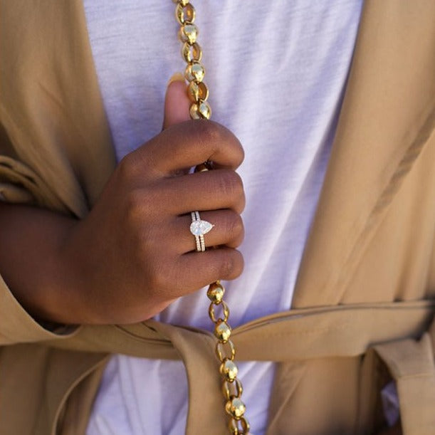✥ Indulge in the timeless allure of our 2.0ct Pear Cut Hidden Halo Moissanite Diamond Ring, a mesmerizing embodiment of love and sophistication. The pear-cut centerpiece, boasting 2.0 carats of exquisite moissanite, takes center stage with its elegant teardrop shape, reflecting light in a dance of brilliance. The hidden halo surrounding the pear-cut stone adds a touch of mystery and enchantment, creating an ethereal glow that enhances the ring's overall allure. The intricately designed band features additional petite diamonds, contributing to the ring's undeniable sparkle and grace. Set in a choice of high-quality metals, this engagement ring is a perfect blend of modern aesthetics and classic charm, symbolizing a love that is both enduring and extraordinary. With its unique design and timeless elegance, this ring is an impeccable choice to declare your commitment and celebrate the beauty of a love that knows no bounds. Embark on a journey of eternal love with the 2.0ct Pear Cut Hidden Halo Moissanite Diamond Ring.