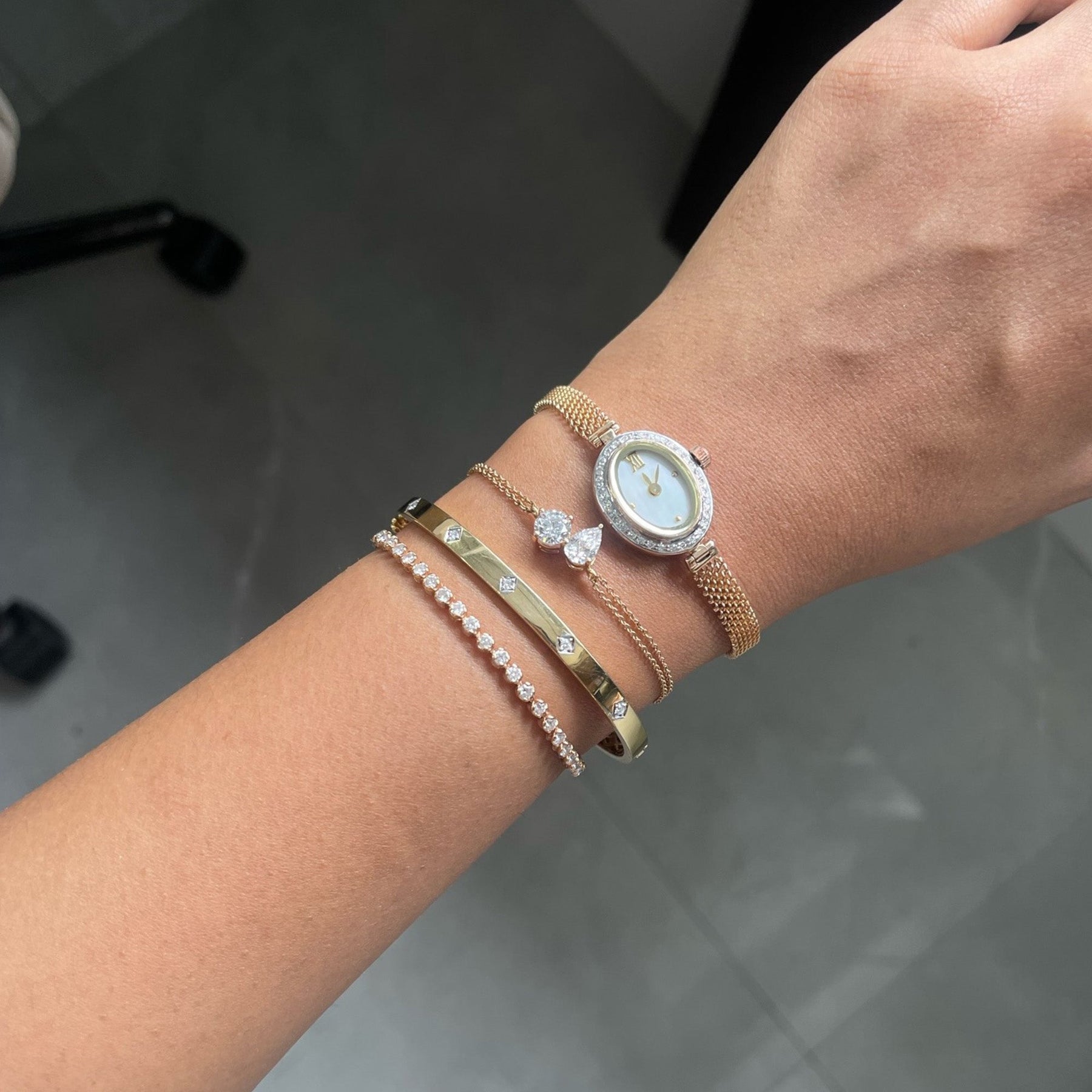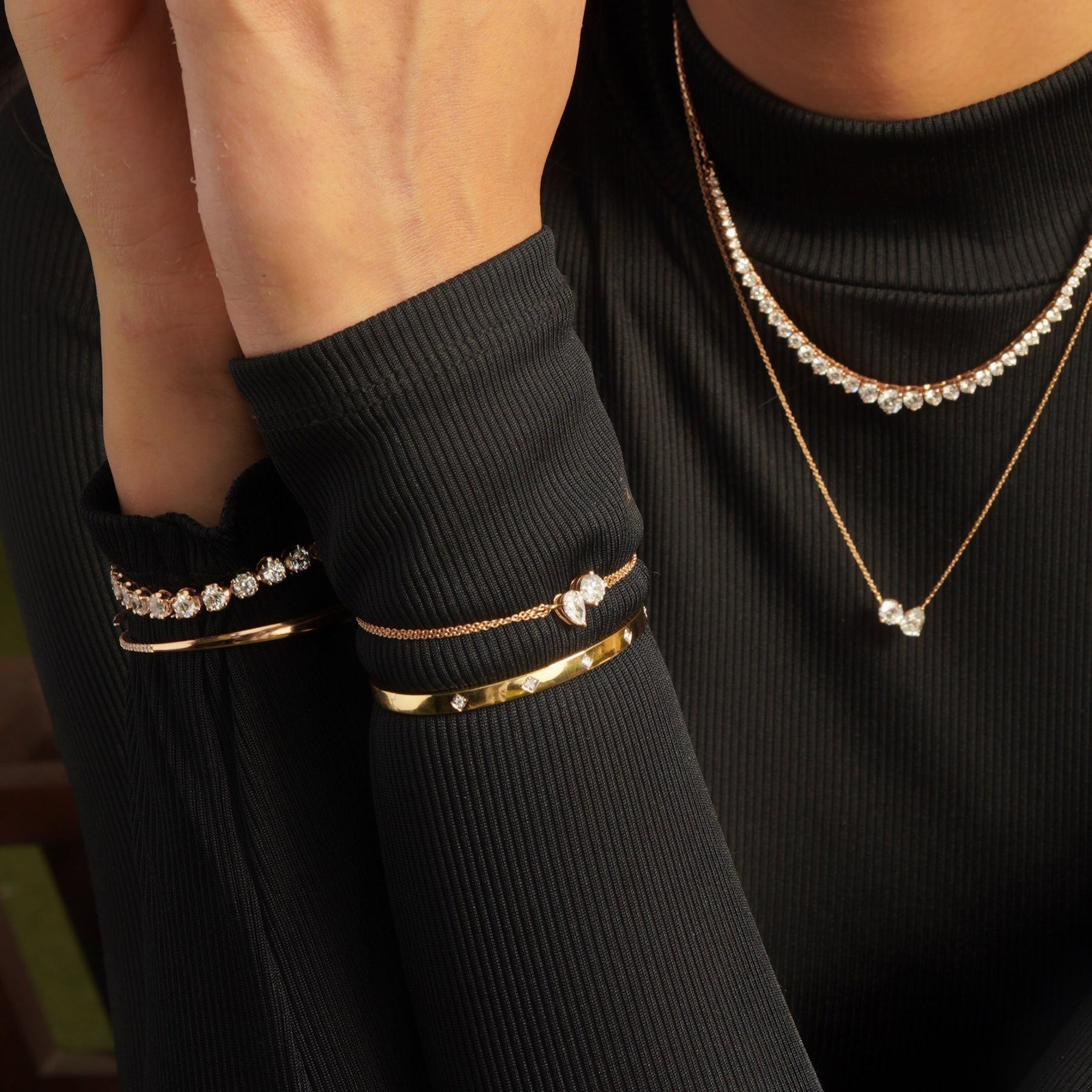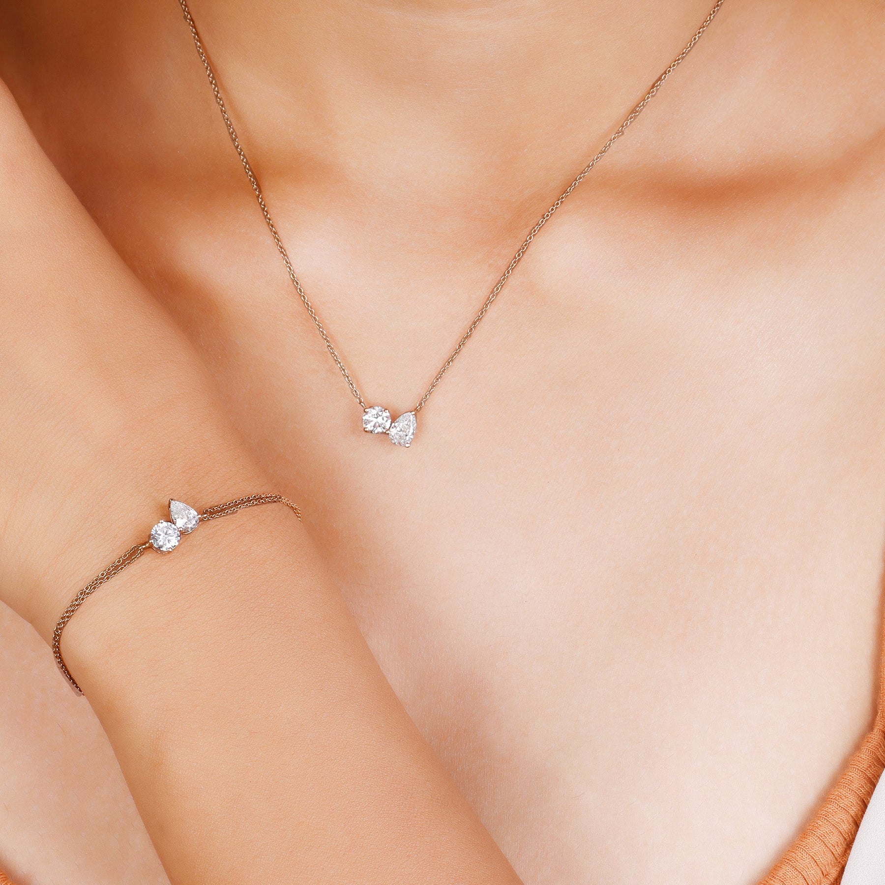 Illuminate her wrist with the enchanting beauty of our 1.0ct Round & Pear Cut Two Stone Moissanite Diamond Bracelet for Women. Meticulously crafted, this bracelet features a captivating combination of round and pear-cut Moissanite diamonds, exuding elegance and sophistication. Each diamond is expertly set to maximize its brilliance and sparkle, creating a mesmerizing display of luxury. Set in a classic bracelet design, the two-stone arrangement adds a touch of uniqueness and symbolism to the piece. Whether worn as a standalone statement or paired with other bracelets for a layered look, this bracelet is sure to turn heads and elevate any ensemble. Perfect for both formal occasions and everyday wear, it's a versatile addition to any jewelry collection. Whether gifted to a loved one or as a cherished indulgence for oneself, this exquisite bracelet is destined to be treasured for its timeless beauty and allure.