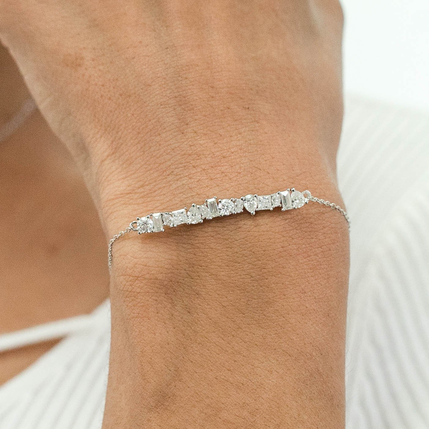 ✦ Adorn her wrist with our enchanting 1.83ct Mix Shape Moissanite Cluster Diamond Bracelet for Women. Each meticulously crafted link showcases a stunning cluster of mixed-shape Moissanite diamonds, exuding elegance and charm. The intricate arrangement of diamonds creates a captivating sparkle and brilliance, while the bracelet design ensures comfort and security. Whether worn as a standalone statement piece or paired with other bracelets for a layered look, this bracelet adds a touch of glamour to any ensemble. Perfect for both formal occasions and everyday wear, it's a timeless addition to any jewelry collection. Whether gifted to a loved one or cherished as a personal indulgence, this bracelet is sure to be treasured for its beauty and sophistication.