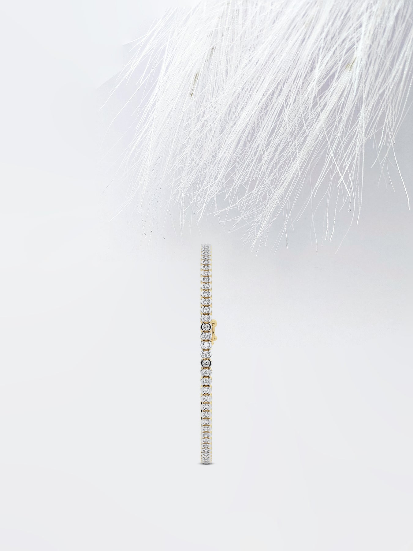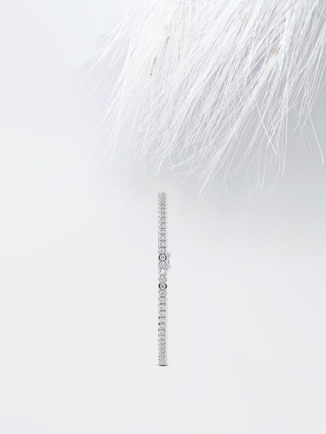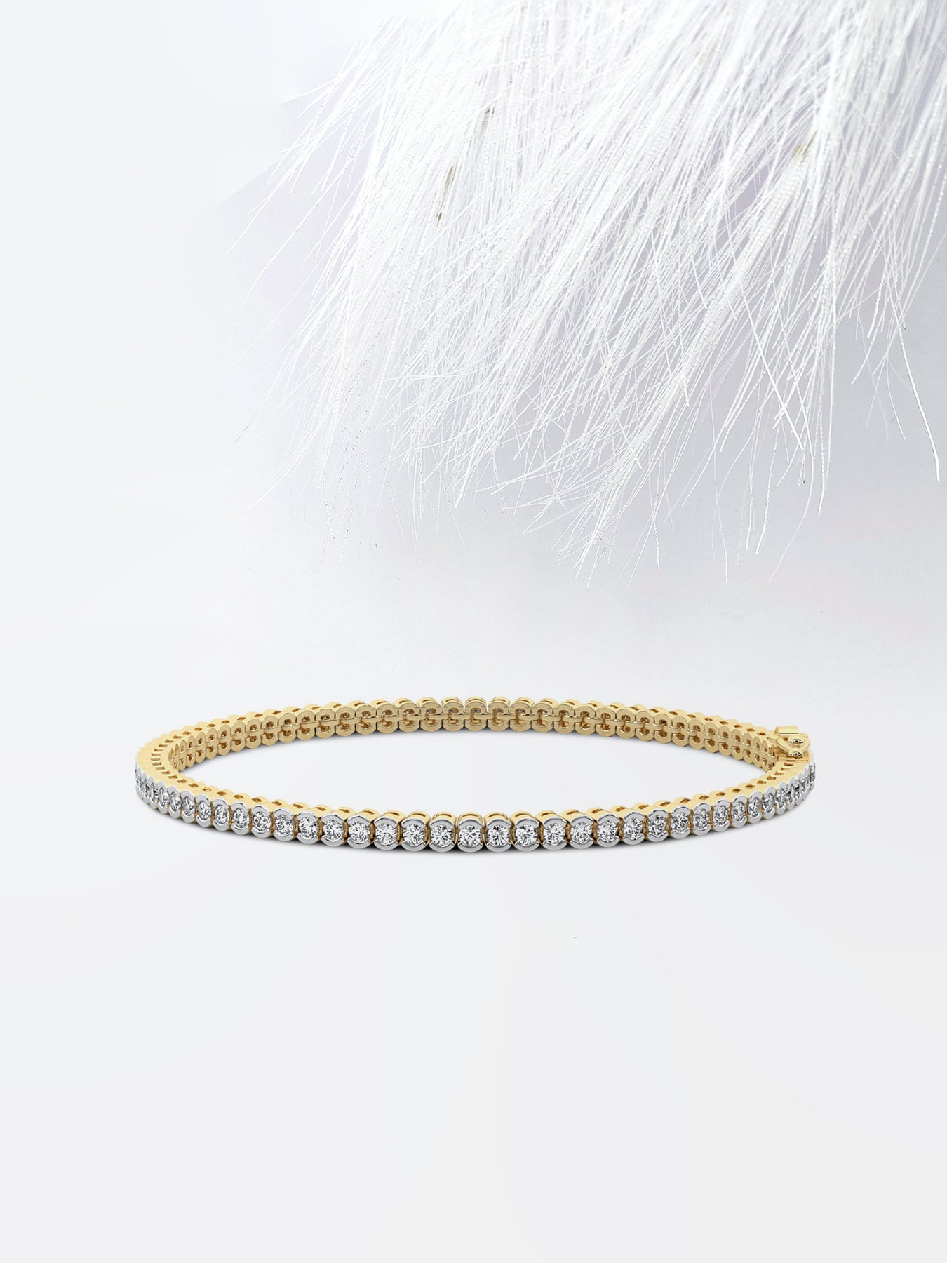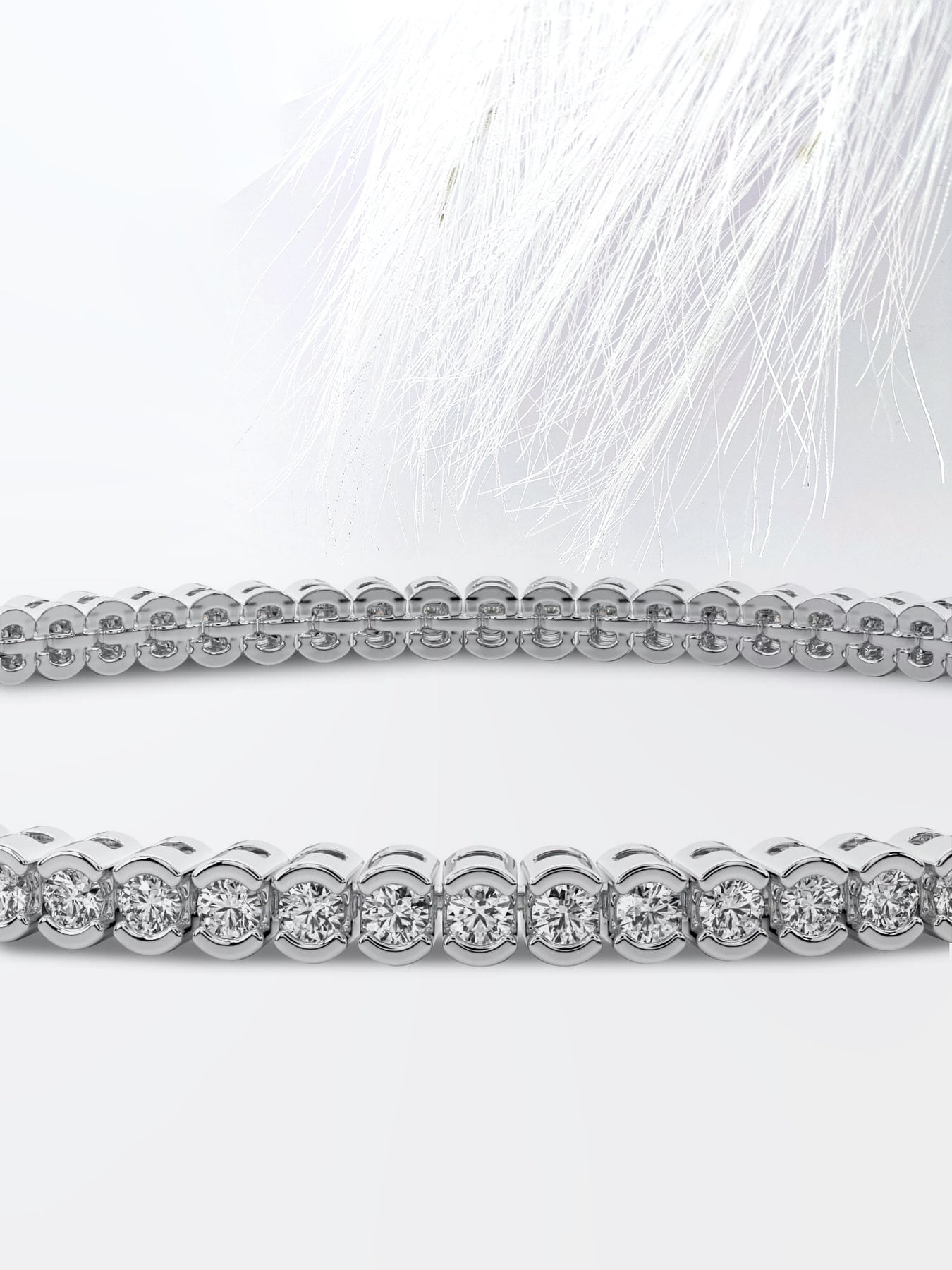 Illuminate her wrist with our 3.0ct Round Cut Half Bezel Moissanite Tennis Diamond Bracelet, crafted in exquisite 14k White Gold. Each link showcases a radiant round-cut Moissanite diamond, delicately cradled in a sleek half-bezel setting, ensuring both security and elegance. Set in a classic tennis bracelet design, these shimmering stones create a seamless display of timeless sophistication and glamour. Whether for special occasions or daily elegance, this bracelet is a captivating addition to any ensemble. A perfect gift to celebrate love or to elevate your own collection, this bracelet embodies enduring beauty and style.