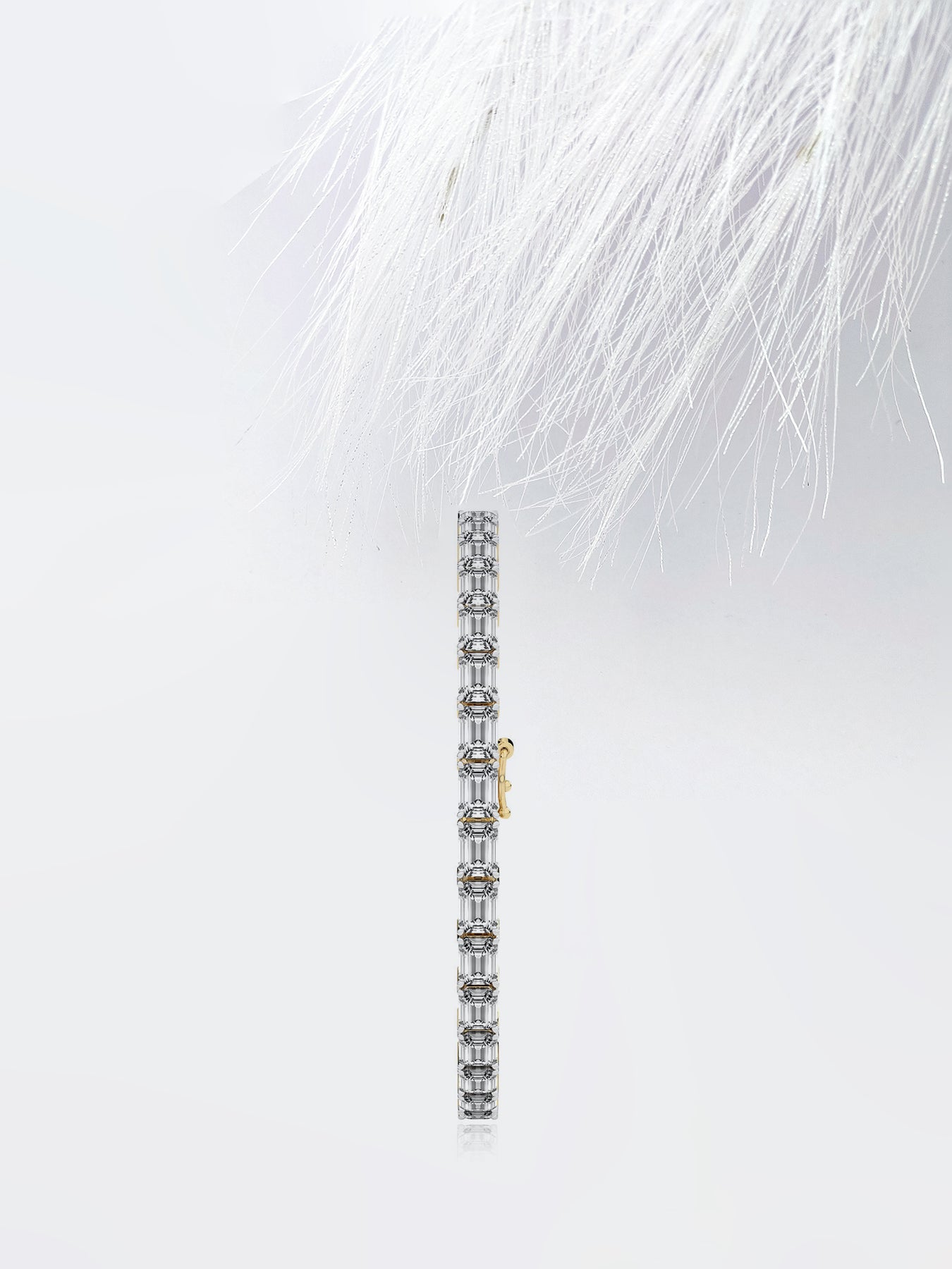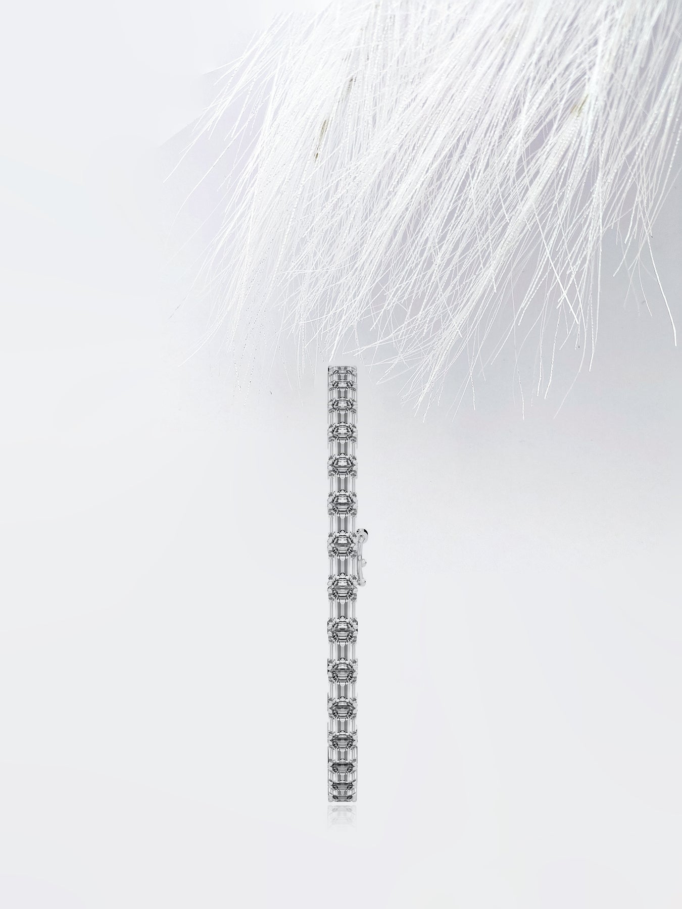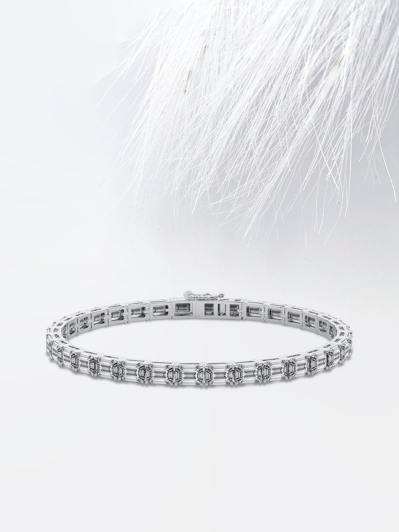 ✥ Dazzle her wrist with our stunning 7.0ct Emerald Cut Moissanite Tennis Diamond Bracelet, crafted for the modern woman who appreciates timeless elegance. Set in radiant 14k White Gold, each link showcases a mesmerizing emerald-cut Moissanite diamond, renowned for its clarity and brilliance. Adorning a classic tennis bracelet design, these shimmering stones create a seamless and luxurious display of sophistication. Whether for a special occasion or everyday glamour, this bracelet exudes refined beauty and charm. An exquisite gift to celebrate love or elevate personal style, this bracelet is destined to be treasured for its enduring sparkle and grace.