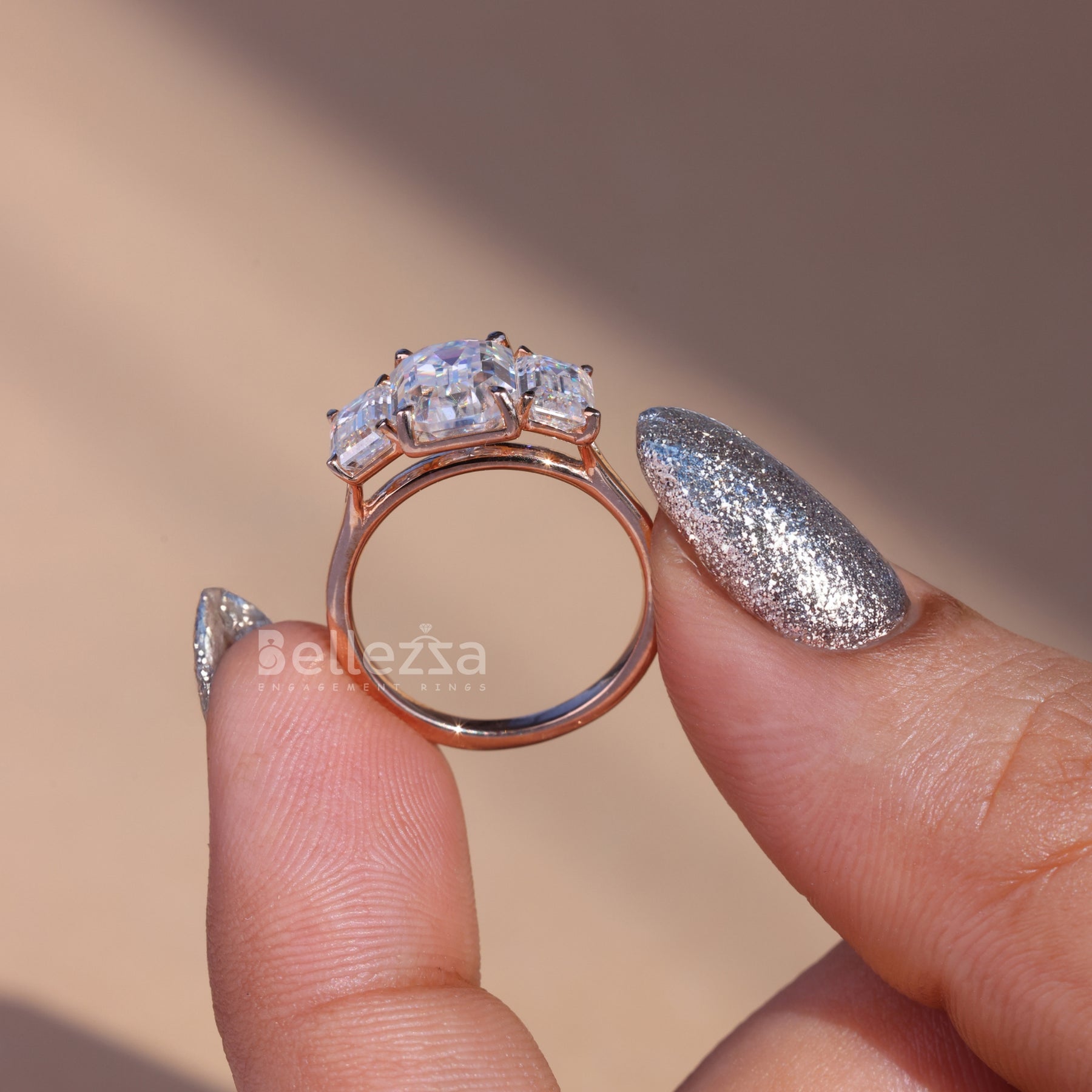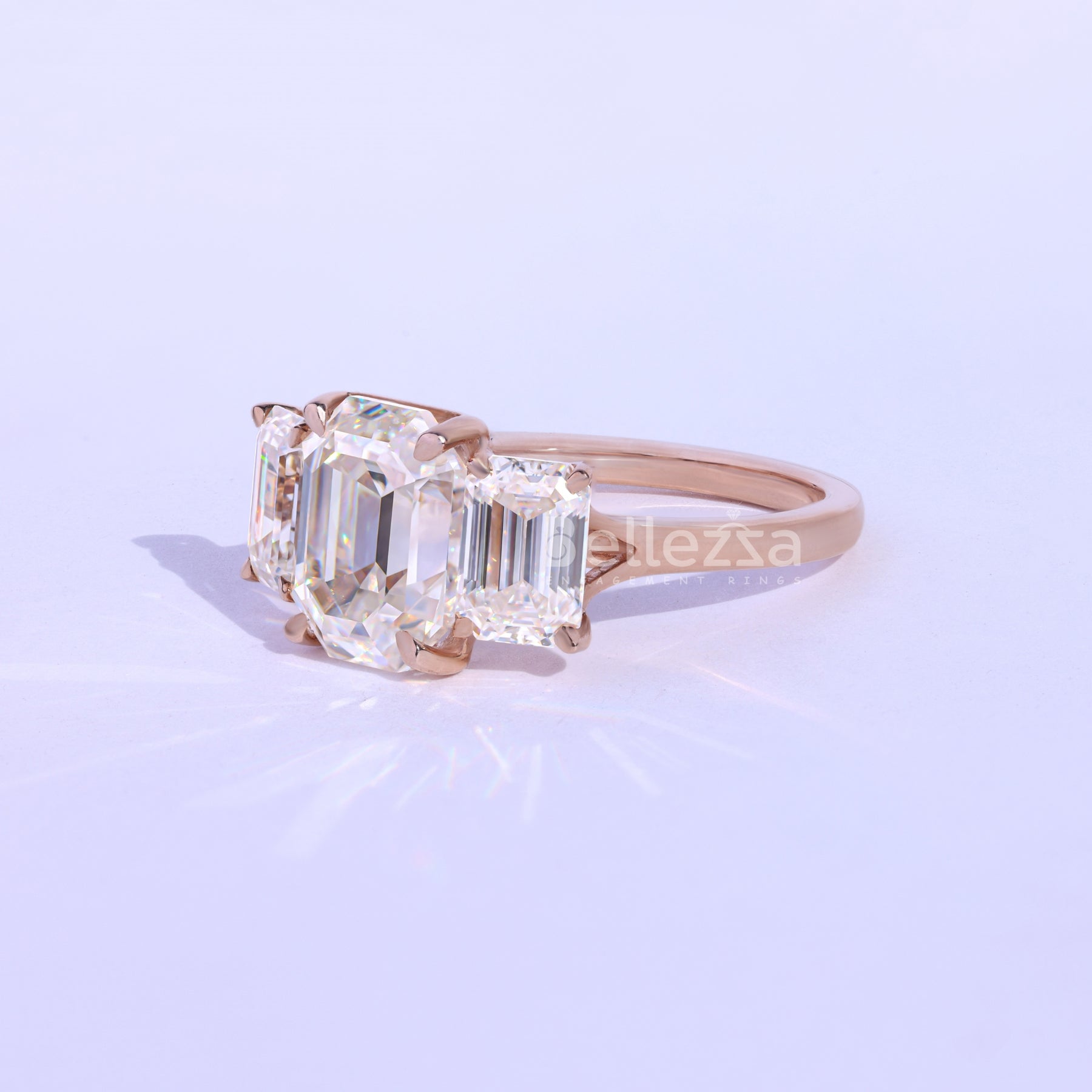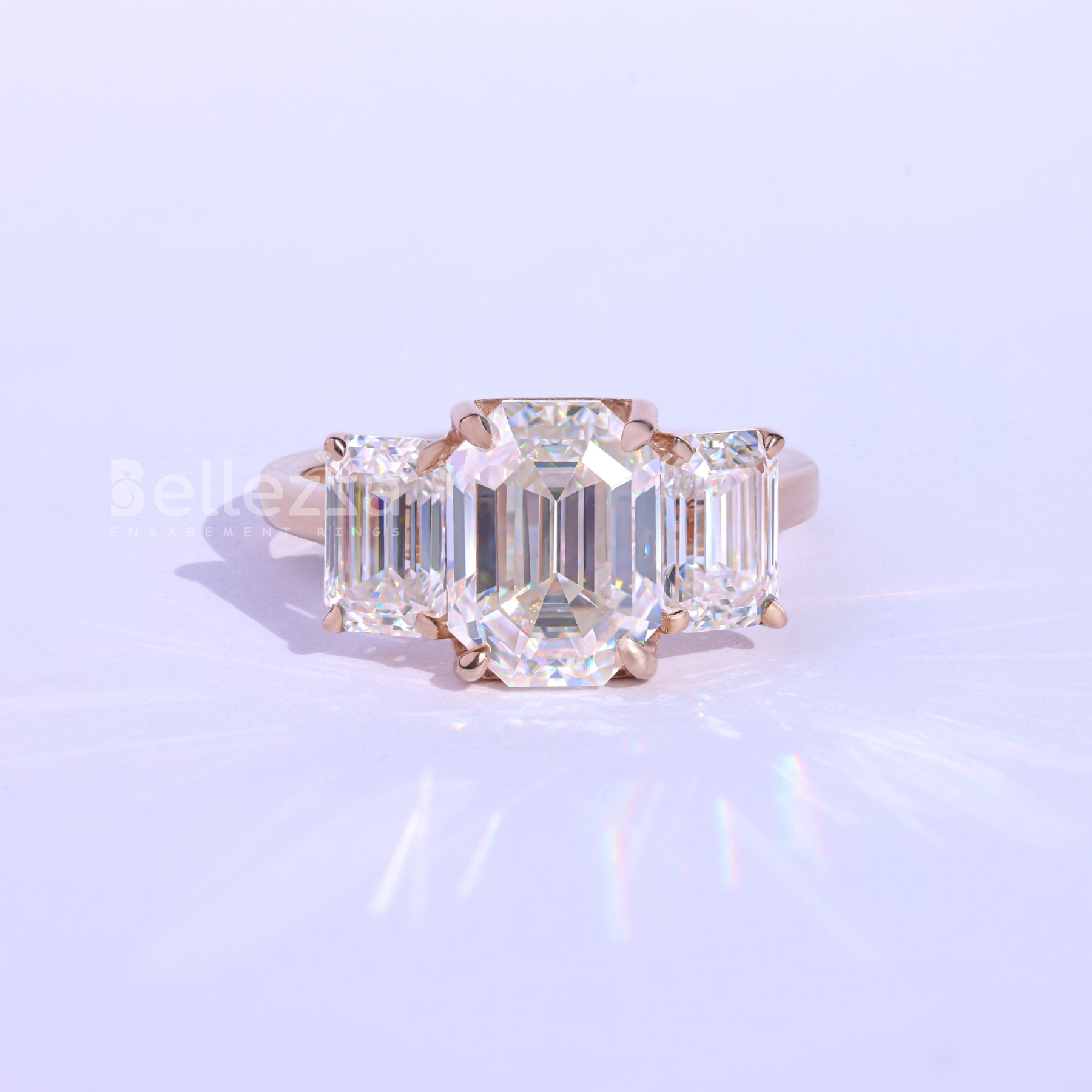 This 2.0CT Emerald Cut Three Stone Engagement Ring is a timeless symbol of love, crafted in 10K rose gold for a warm and romantic appeal. The striking emerald-cut center stone is complemented by two dazzling side stones, enhancing its brilliance and elegance. Designed for those who appreciate classic beauty with a modern touch, this ring is perfect for engagements or special occasions. Available in size 4.0 US and ready to ship, this exquisite piece ensures a seamless and effortless purchase for your unforgettable moment.