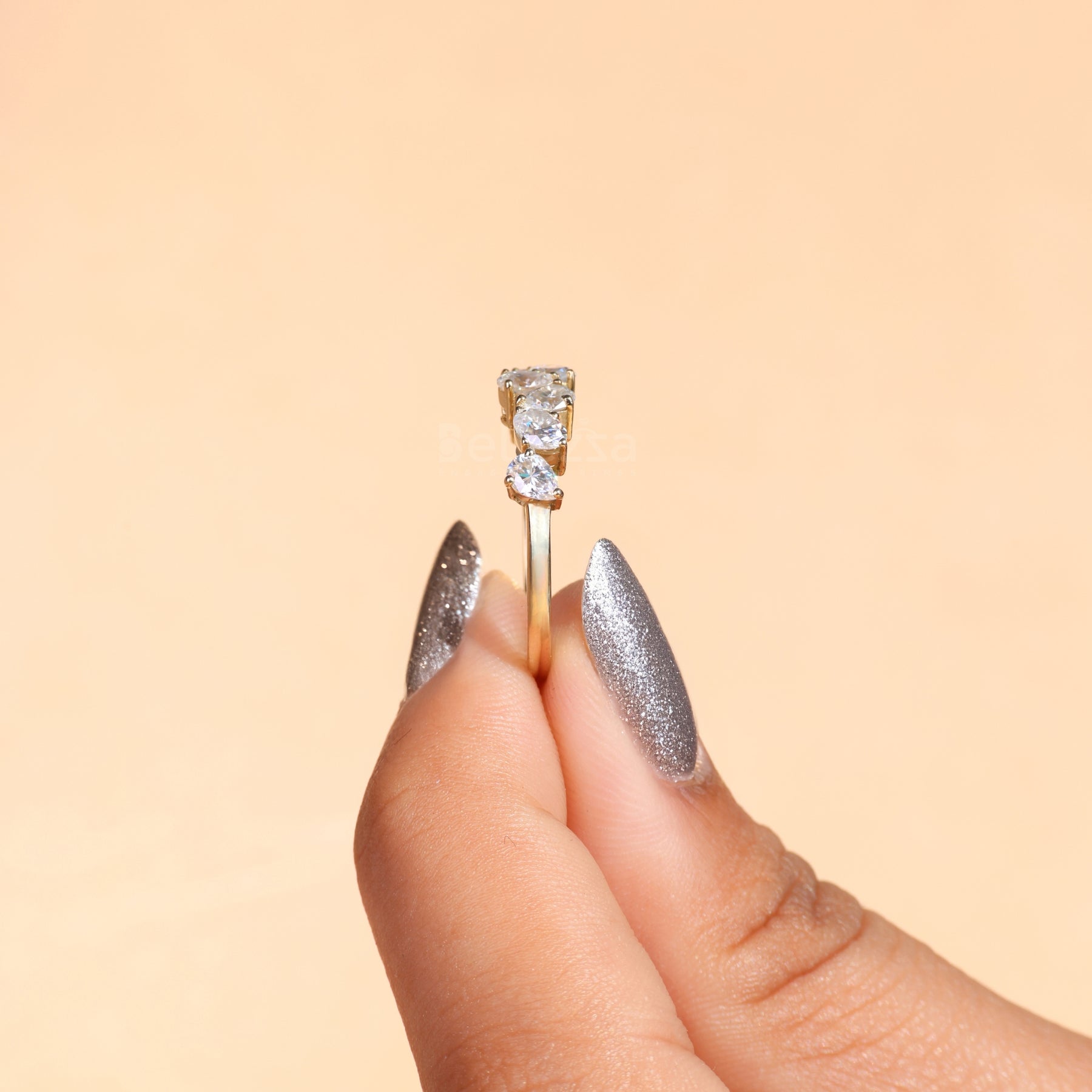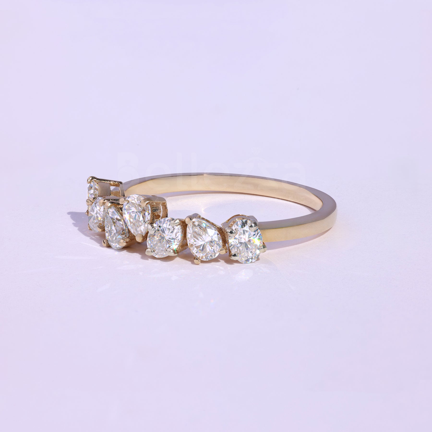 ✥ This graceful half eternity wedding band features alternating pear and oval cut moissanite stones, totaling 0.90 TCW, for a unique and elegant design. Set in 10K yellow gold, the band offers a warm, classic glow that enhances the brilliance of the moissanite. Available in size 5.75 US, it provides a comfortable and stylish fit. Ready to ship, this stunning band is available for next-day dispatch, ensuring a fast and effortless delivery.