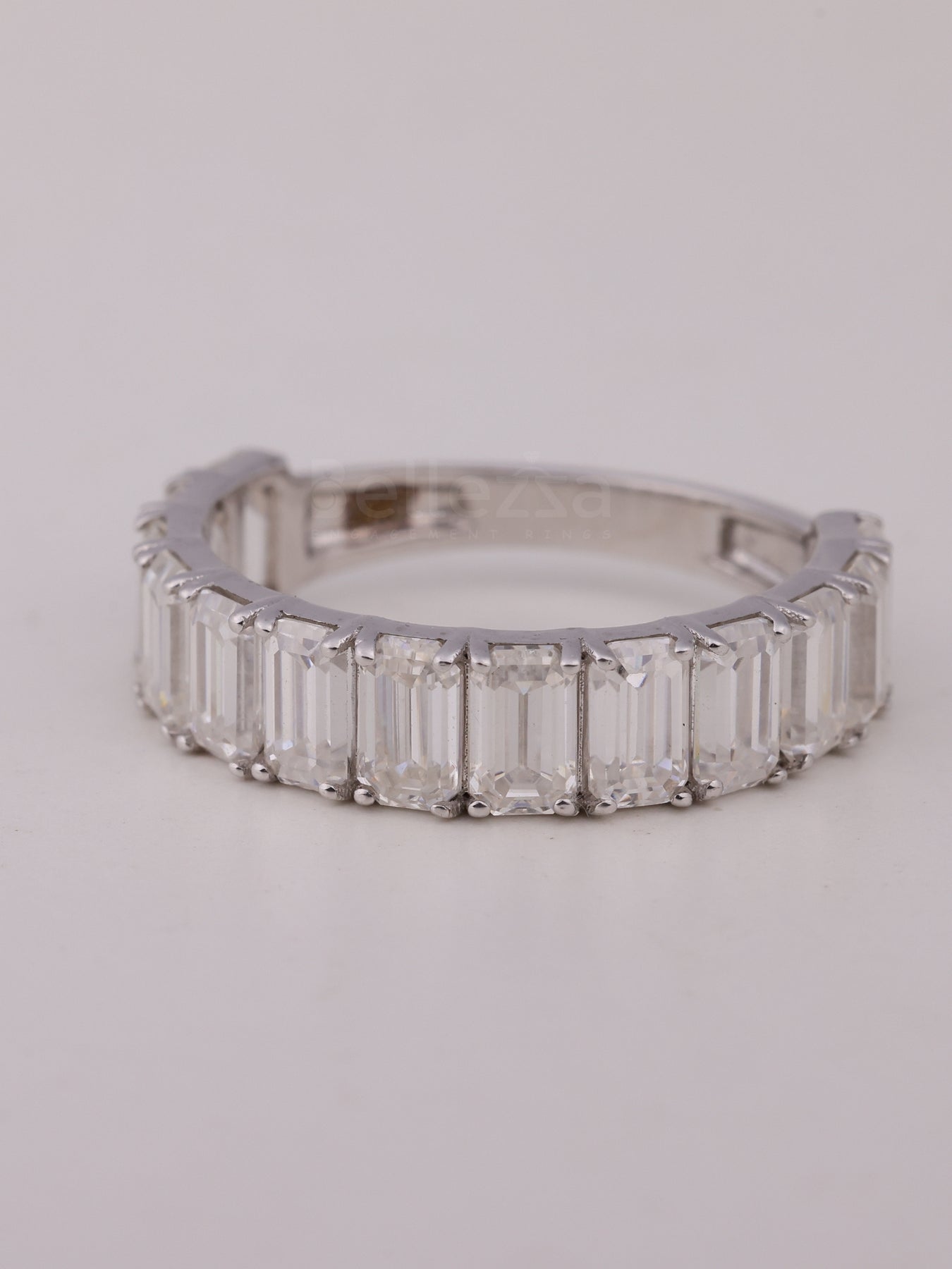 ✥This 1.50TCW emerald cut half eternity wedding band for her shines with sleek sophistication and timeless elegance. Gleaming emerald-cut stones are set halfway around the band, offering a brilliant sparkle that catches every light. Crafted to complement any style, this band blends classic beauty with modern flair. Perfect for celebrating love with understated luxury and lasting shine.