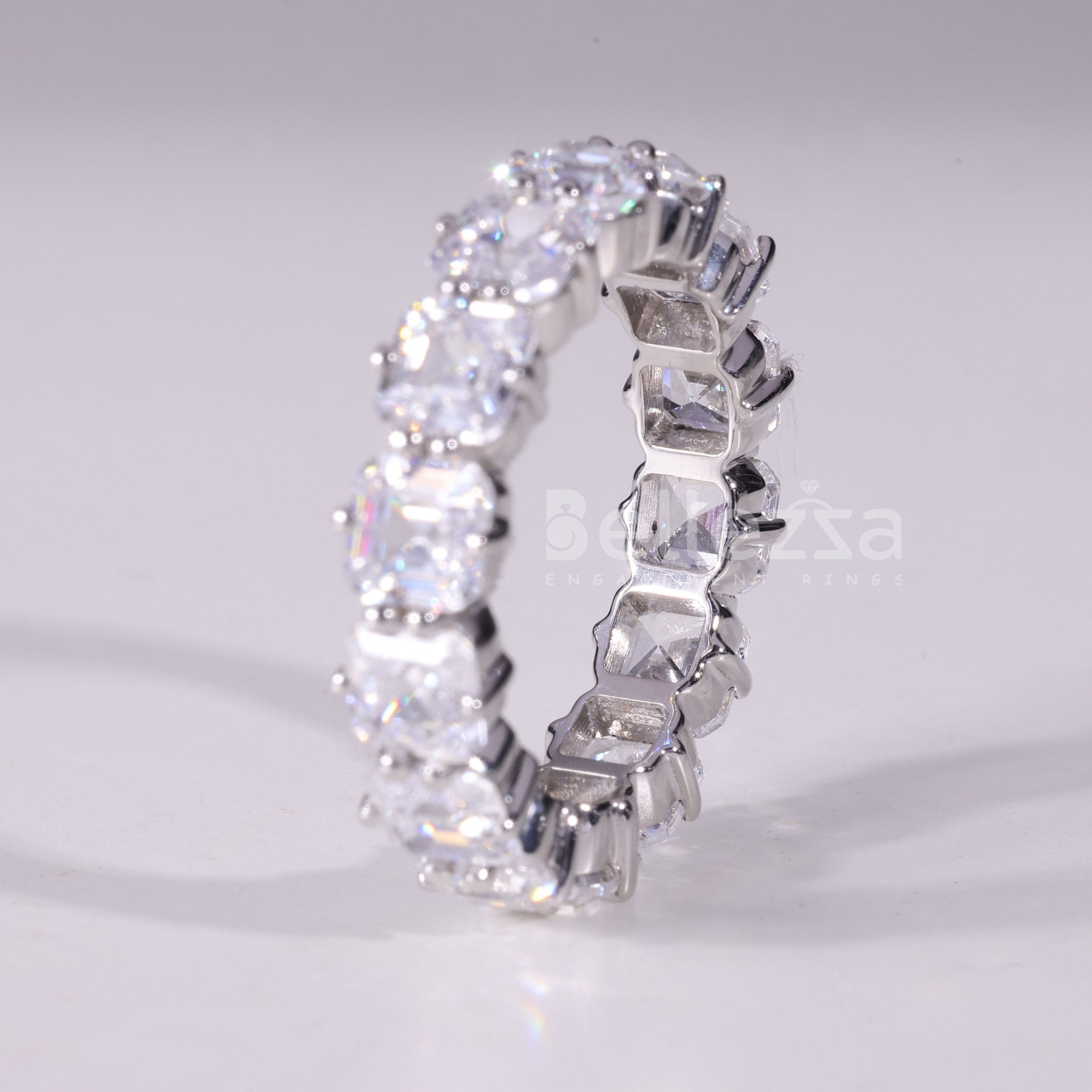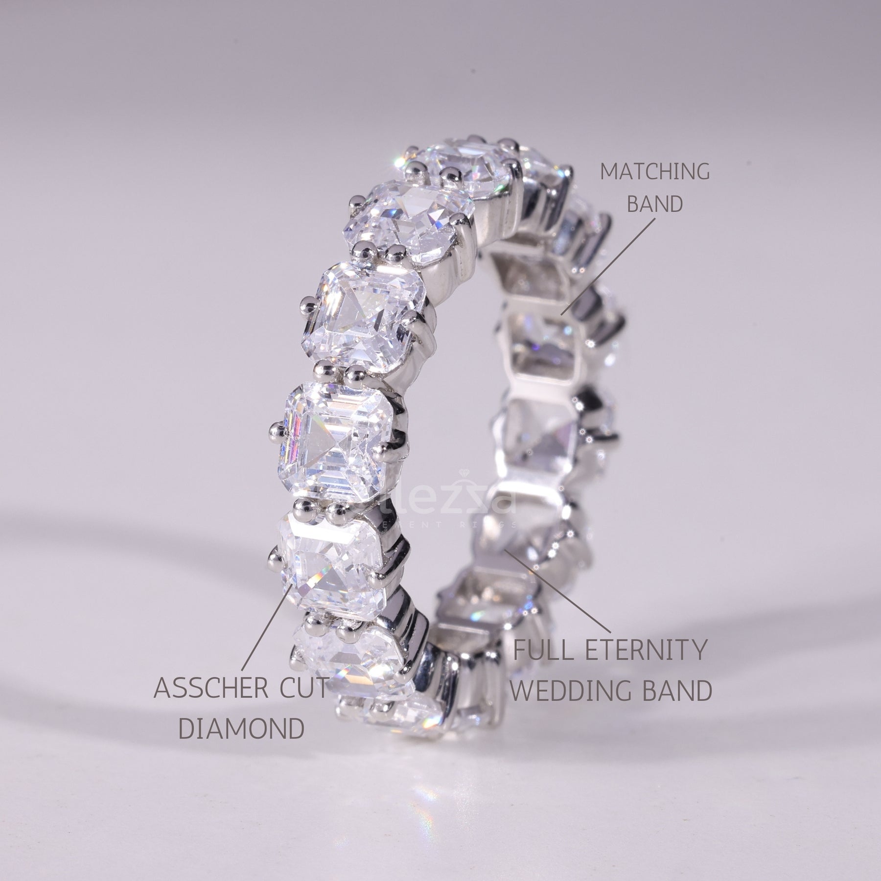 The image showcases our elegant Asscher Cut Full Eternity Moissanite Wedding Band, a timeless expression of everlasting love. This breathtaking band features perfectly aligned asscher cut moissanite stones encircling the entire ring for continuous sparkle. Crafted for sophistication, this full eternity wedding band symbolizes eternal commitment with its seamless design. Each stone is hand-set to maximize brilliance, making this moissanite wedding band an ideal choice for weddings or anniversaries. With its luxurious style and enduring shine, this asscher cut wedding ring beautifully complements engagement rings or stands out on its own.