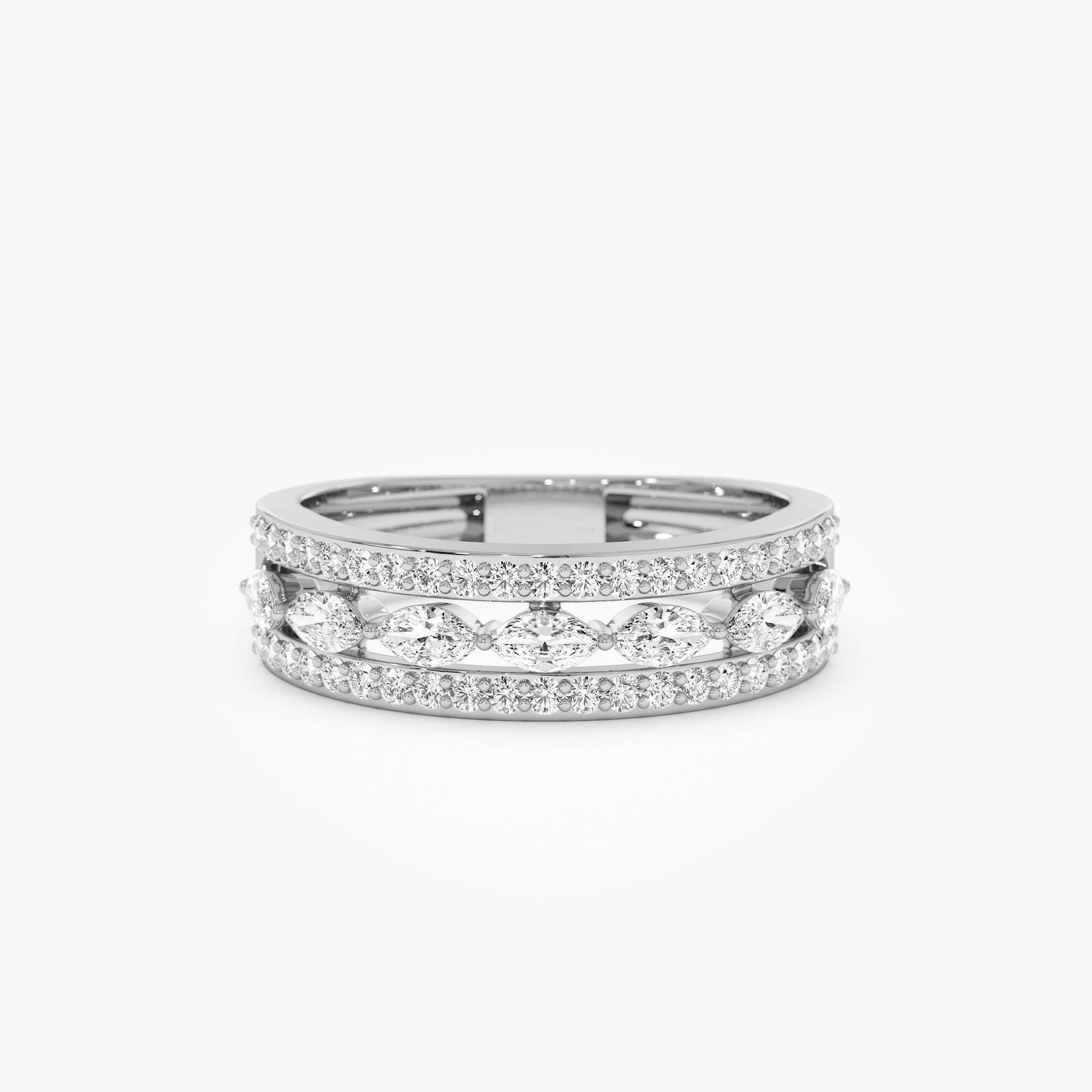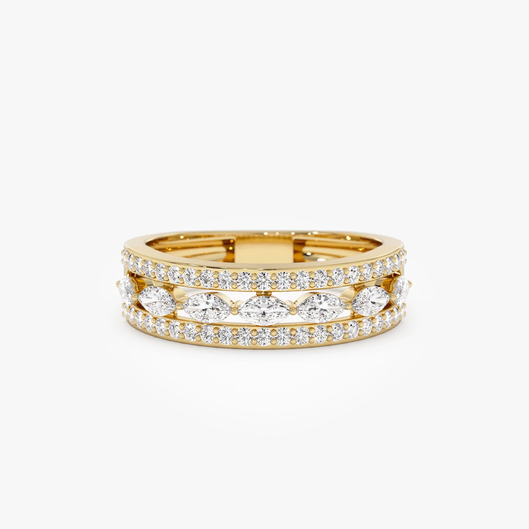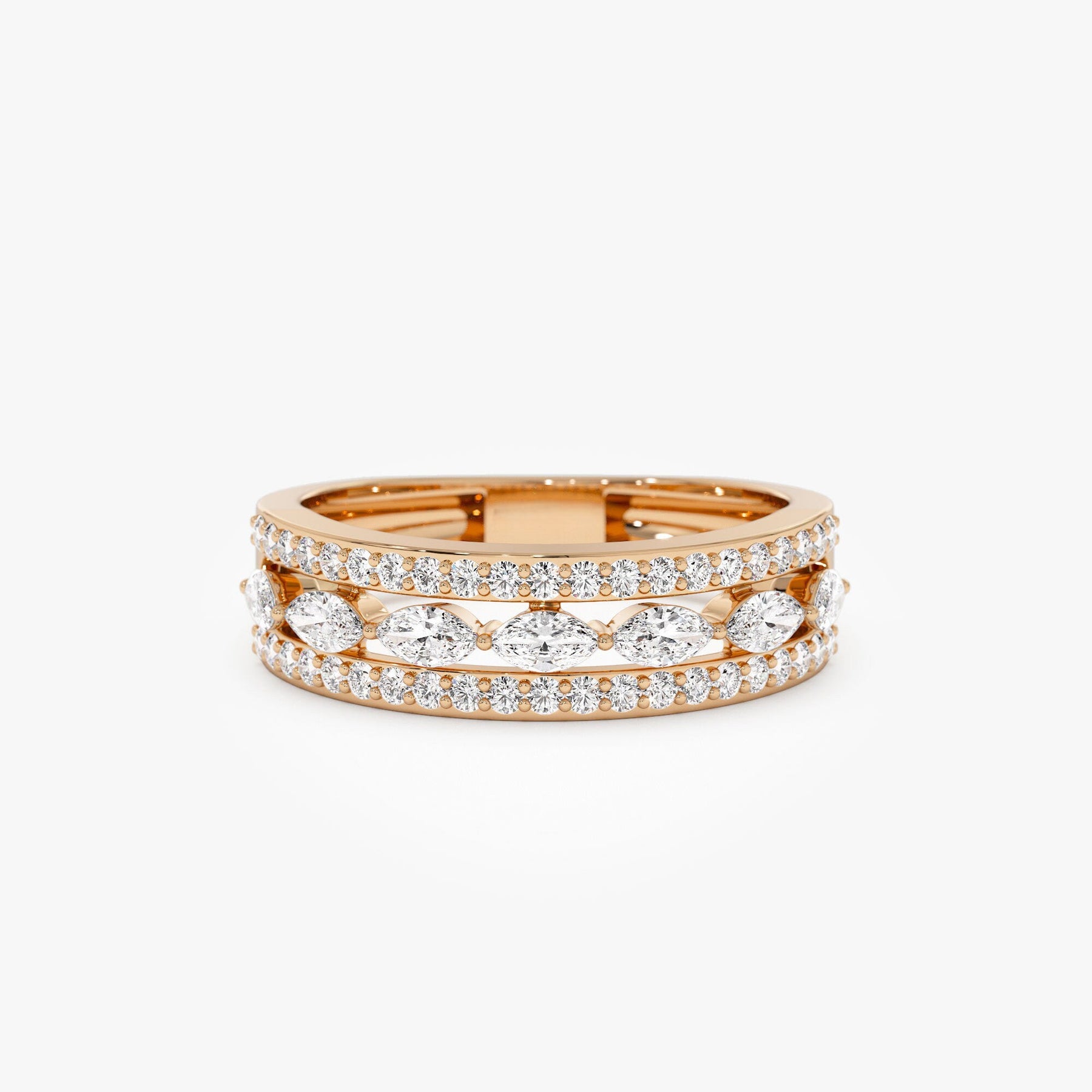✥ The Double Row Floating Marquise and Round Wedding Band is a captivating piece that adds a touch of glamour to any bridal ensemble. This exquisite wedding band features a unique design with alternating marquise and round-cut diamonds, set in a double row for maximum brilliance and sparkle. The floating setting allows the diamonds to move slightly, creating a mesmerizing effect that catches the light from every angle. Crafted with precision and attention to detail, this wedding band is made from high-quality materials to ensure durability and long-lasting beauty. Whether worn alone or paired with an engagement ring, this wedding band is a stunning choice for brides looking to make a statement on their special day.